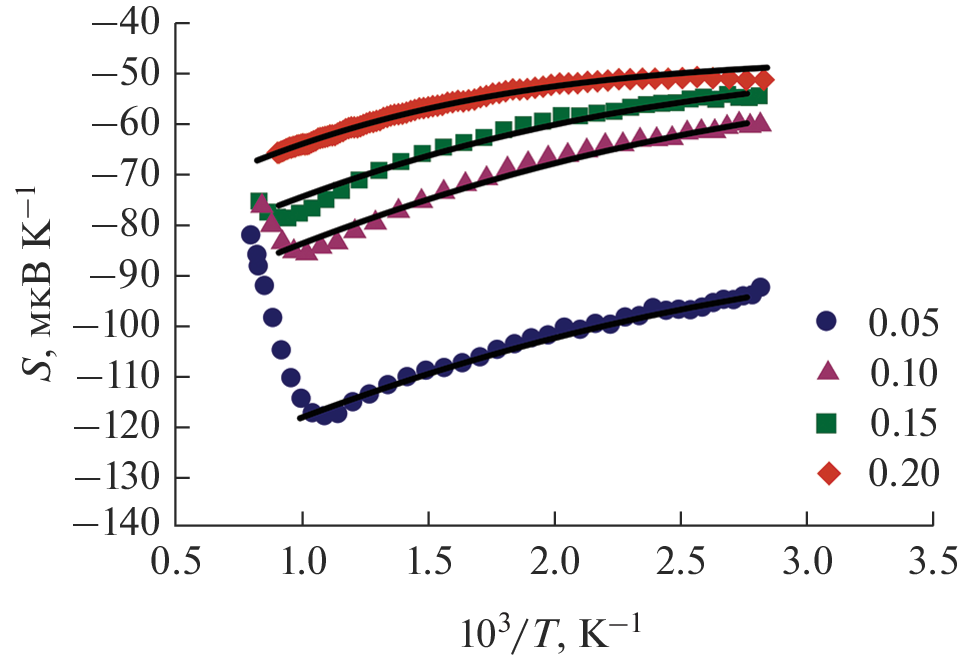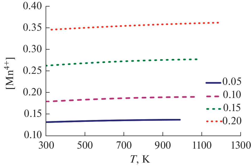 Манганиты Ca0.5 – xSr0.5LuxMnO3 – δ (x = 0.05, 0.10, 0.15 и 0.20) с перовскитоподобной структурой синтезированы на воздухе с использованием цитратно-нитратного метода получения прекурсоров. Показано, что при комнатной температуре составы с x = 0.05, 0.10 и 0.15 имеют ромбическую структуру (пр. гр. Pbnm), при x = 0.2 формируется тетрагональная структура (пр. гр. I4/mcm). Увеличение объема элементарной ячейки с ростом содержания лютеция объясняется увеличением концентрации ионов Mn3+, образование которых обеспечивает электропроводность (σ) n-типа. Температурно-активированный характер электропроводности согласуется с адиабатическим механизмом переноса поляронов малого радиуса. Увеличение абсолютных значений коэффициента Зеебека (S) с ростом температуры объясняется уменьшением концентрации ионов Mn3+ за счет их диспропорционирования на ионы Mn2+ и Mn4+. На основе температурных зависимостей S(T) и σ(T) в условиях, когда величина δ ⁓ 0, рассчитаны константы равновесия реакции диспропорционирования, концентрации и подвижности носителей заряда.