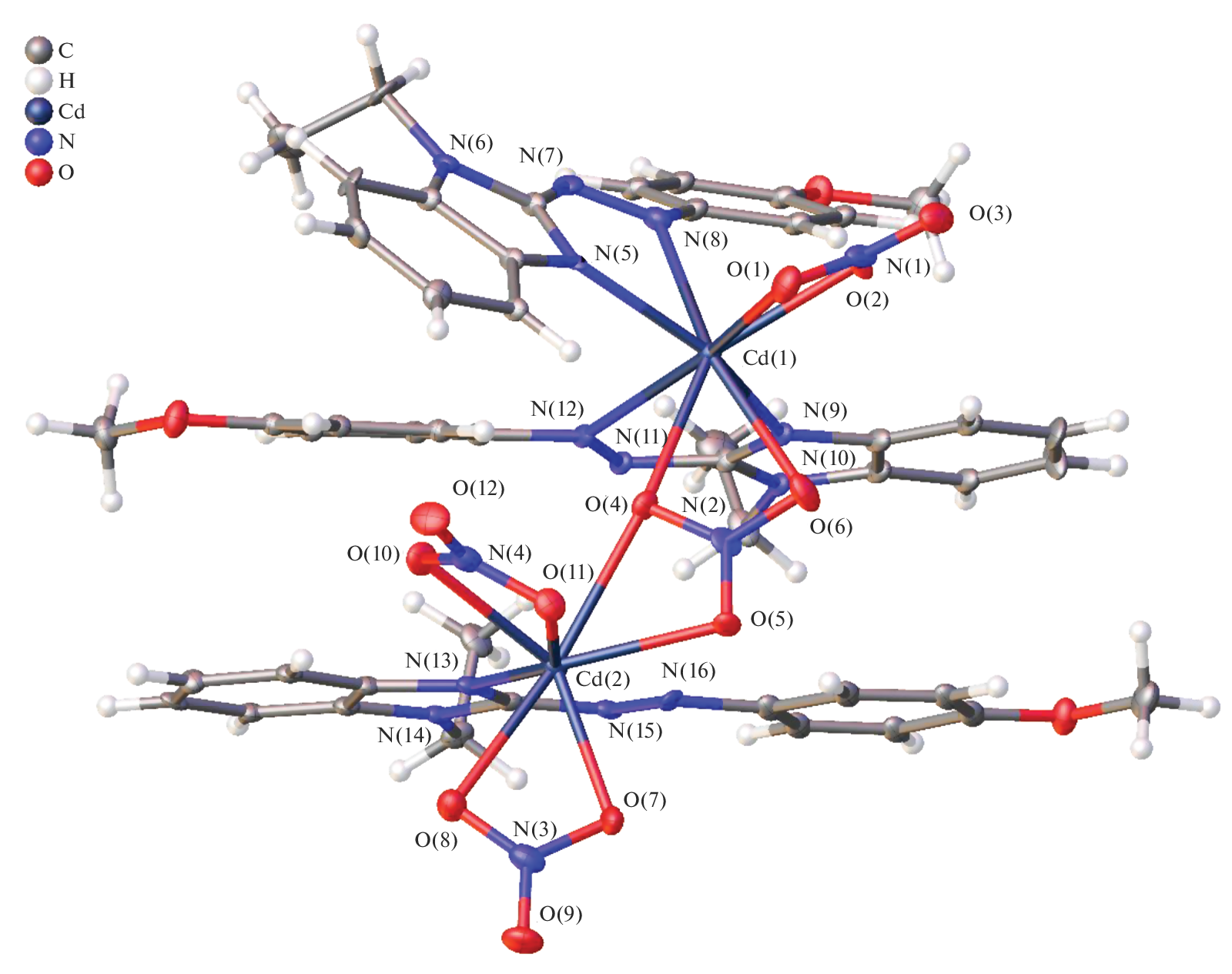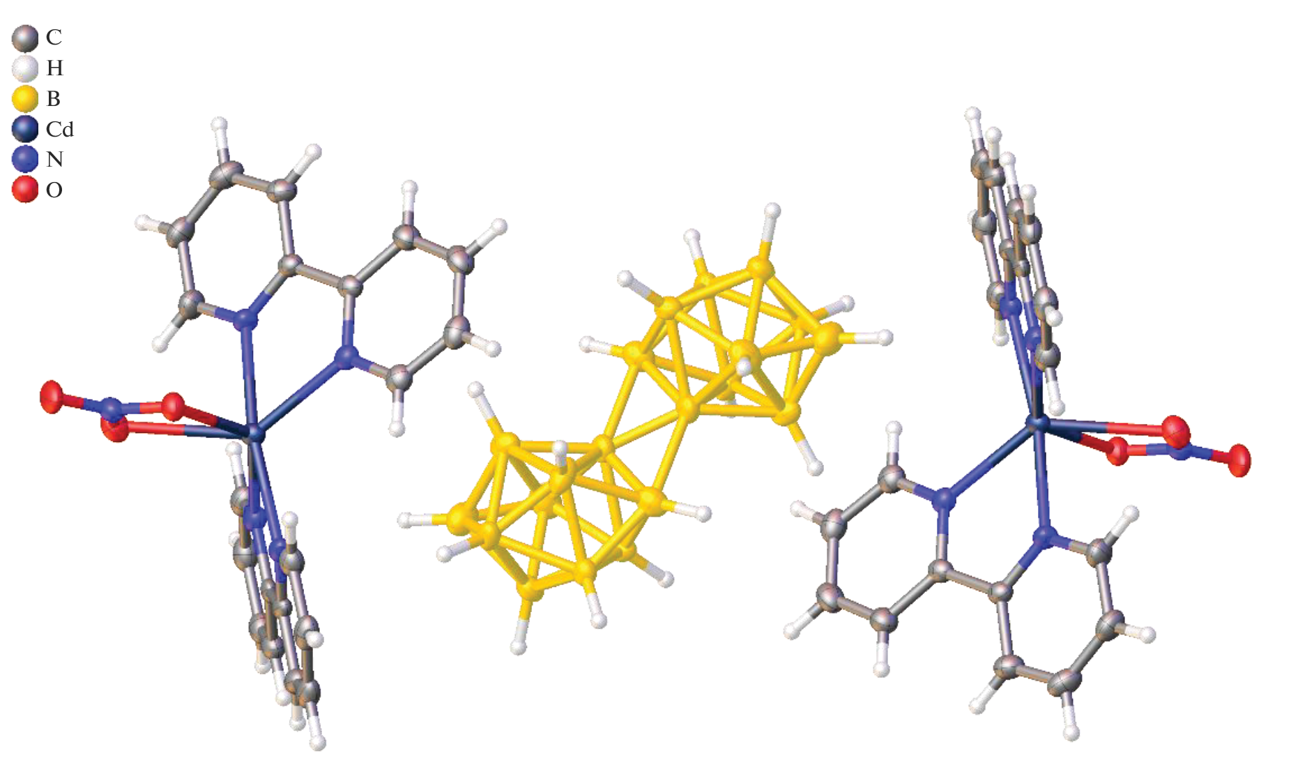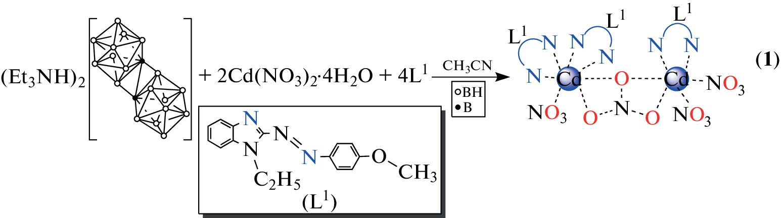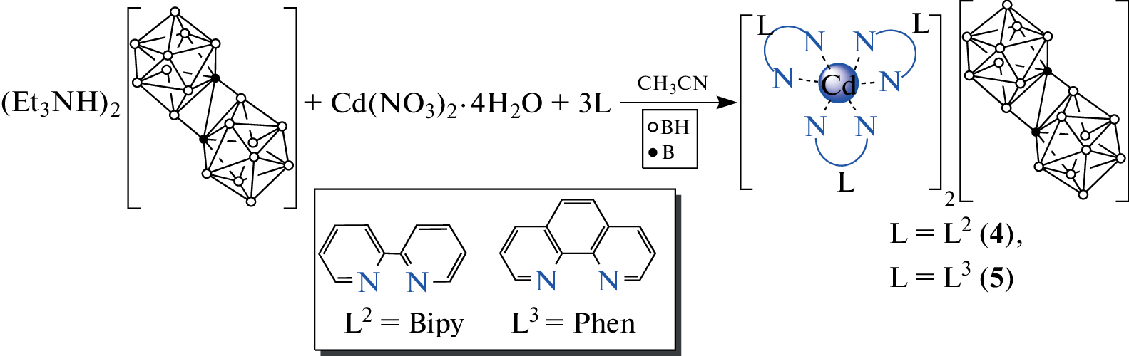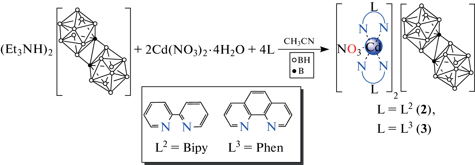 The process of cadmium(II) complexation with 1-ethyl-2-(4-methoxyphenyl)azobenzimidazole (L1), 2,2′-bipyridyl (L2), and 1,10-phenanthroline (L3) in the presence of the [trans-B20H18]2– anion has been studied. It has been found that the nature of the organic ligand affects the composition and structures of the resulting compounds. Complexation with ligand L1, a benzimidazole derivative, has yielded binuclear complex [CdL12NO3(μ-NO3)CdL1(NO3)2] (1), which contains no boron cluster anion. In the case of azaheterocyclic ligands L2 and L3, depending on the Cd : L ratio, heteroleptic complexes [CdL2NO3]2[trans-B20H18] (L = L2 (2); L3 (3)) with coordinated nitrate ions (Cd : L = 1 : 2) or tris-chelate complexes [CdL3][trans-B20H18] (L = L2 (4); L3 (5)) with the boron cluster anion as a counterion (Cd : L = 1 : 3) have been isolated. The structures of complexes [CdL12NO3(μ-NO3)CdL1(NO3)2] (1) and [Cd(L2)2NO3]2[trans-B20H18] (2) have been determined by X-ray diffraction.