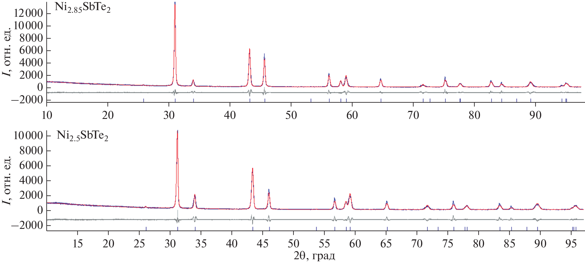 Series of compounds Ni3 – xMTe2 (M = Sb, Sn; x = 0–1) were obtained by high-temperature sealed-tube synthesis and characterized by X-ray powder diffraction and 121Sb and 119Sn Mössbauer spectroscopy. For Ni3–xSnTe2, it was shown that, as х varies from 1 to 0, nickel is distributed over three possible sites, two of which give a total occupancy of 1 and have ordered vacancies. Meanwhile, for Ni3–xSbTe2 and х other than ~0.9–1.0, the vacancy ordering disappears. The temperature dependence of the presence or absence of vacancy ordering was established for Ni2SbTe2; the ordering disappears on heating above 600°C and appears again on cooling.
