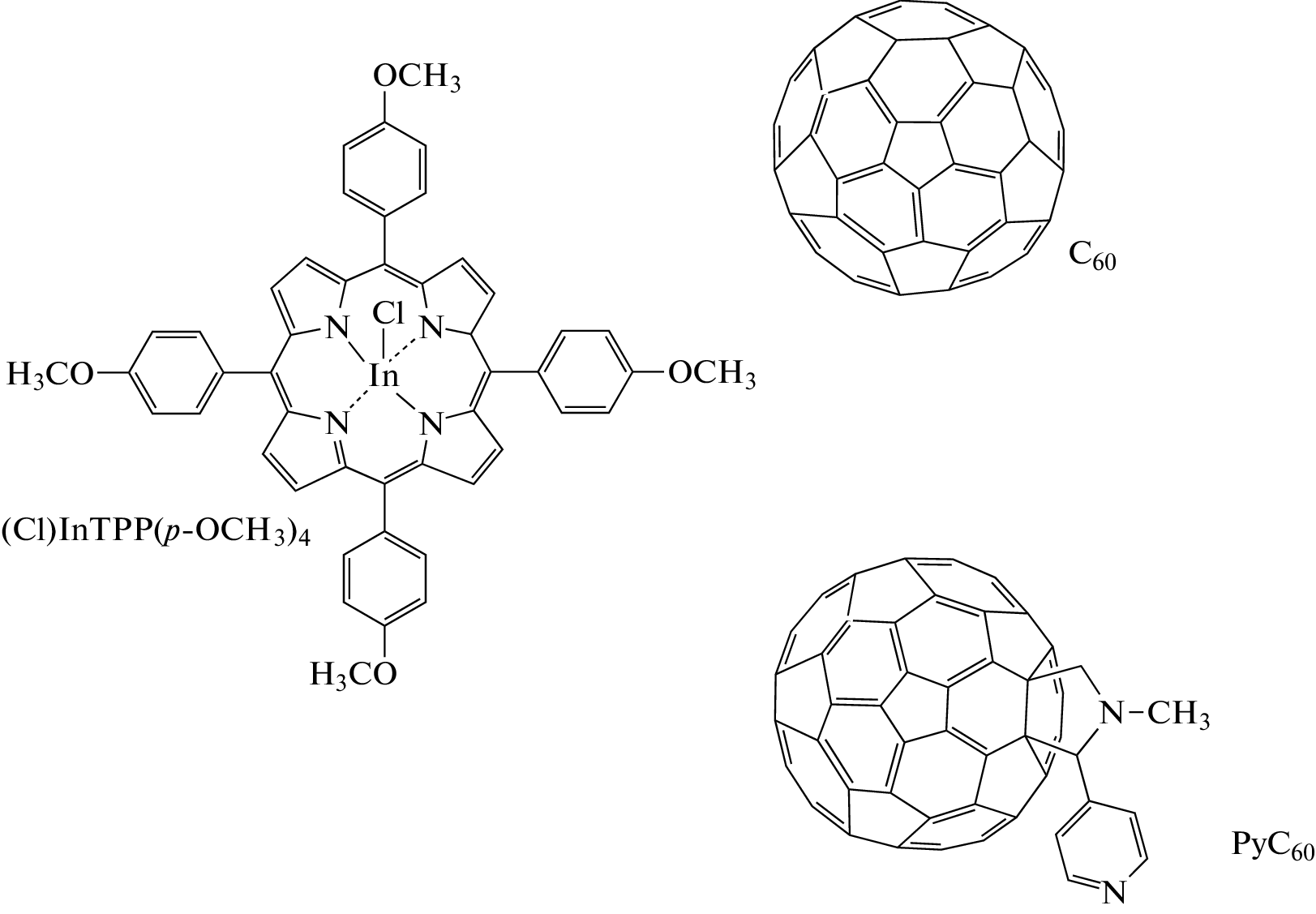 New complexes of [5,10,15,20-tetra-(4-methoxyphenyl)porphinato](chloro)indium(III) ((Cl)InTPP(p-OCH3)4) with unsubstituted C60 and 1-methyl-2-(pyridin-4'-yl)-3,4- fullero[60]pyrrolidine (PyC60) were synthesized in toluene. The stability constants of 1 : 1 complexes (dyads) were determined using UV-vis and fluorescence spectroscopy. The dyads were characterized by IR and 1H NMR spectroscopy data. It was established that fluorescence of (Cl)InTPP(p-OCH3)4 is quenched upon gradual addition of fullerenes. The numerical values of the Stern–Volmer quenching constants (KSV) were determined. The most important charge transfer characteristics of dyads (the lifetime of charge-separated states and charge separation and recombination constants), needed for further consideration of dyads based on indium(III) porphyrins as photoinduced electron transfer systems, were determined using femtosecond laser spectroscopy.