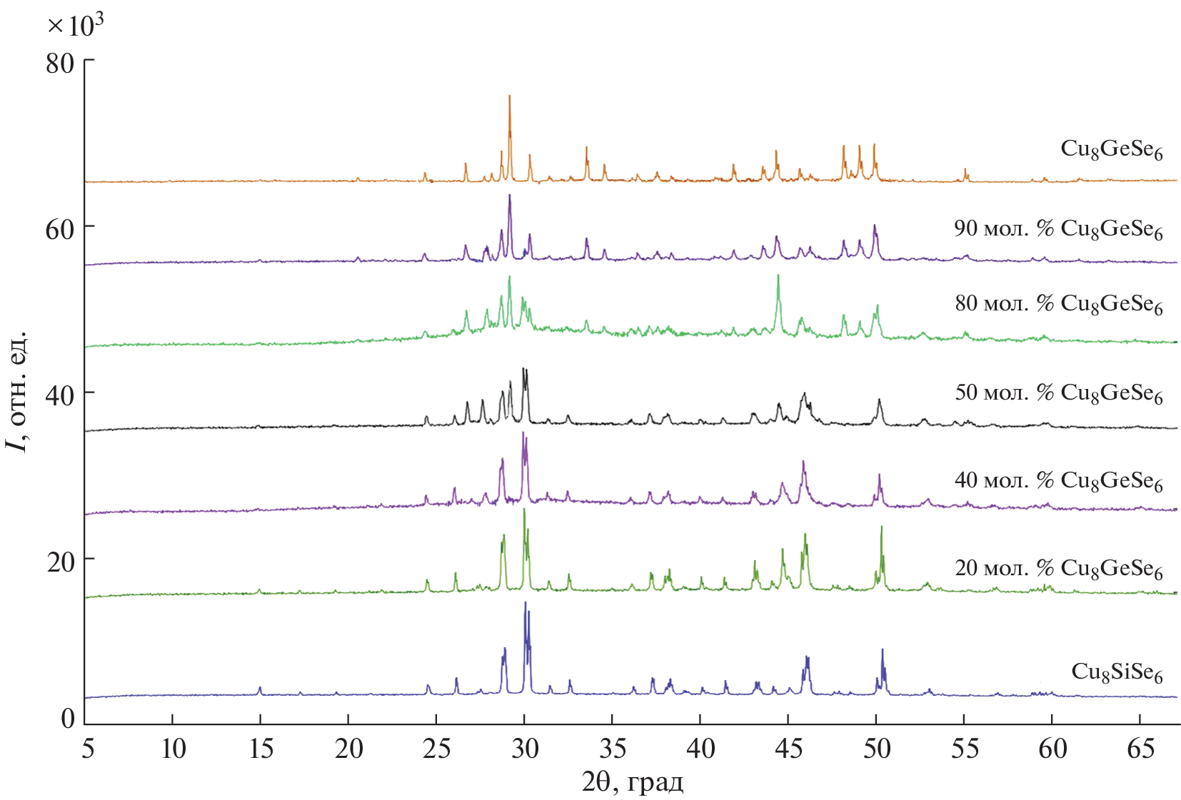 Phase equilibria in the Cu2Se–Cu8SiSe6–Cu8GeSe6 area of the Cu2Se–SiSe2–GeSe2 system have been studied using differential thermal analysis (DTA), X-ray powder diffraction analysis (XRD), scanning electron microscopy (SEM), and energy-dispersive spectroscopy (EDX). The results served to plot a Т–х diagram of the Cu8SiSe6–Cu8GeSe6 boundary system, a series of polythermal sections, and a 300-K isothermal section of the phase diagram and a liquidus surface projection for the title system. The primary crystallization and homogeneity fields of phases, and the characters and temperatures of invariant and monovariant equilibria have been determined. In the Cu8SiSe6–Cu8GeSe6 boundary system, continuous solid solutions have been found to exist between the high-temperature phases of the terminal compounds and extensive homogeneity area based on their low-temperature phases were found. The crystal lattice types and unit cell parameters have been determined for the terminal compounds and both phases of solid solutions using X-ray powder diffraction data. The prepared phases of variable composition are of interest as environmentally friendly functional materials.