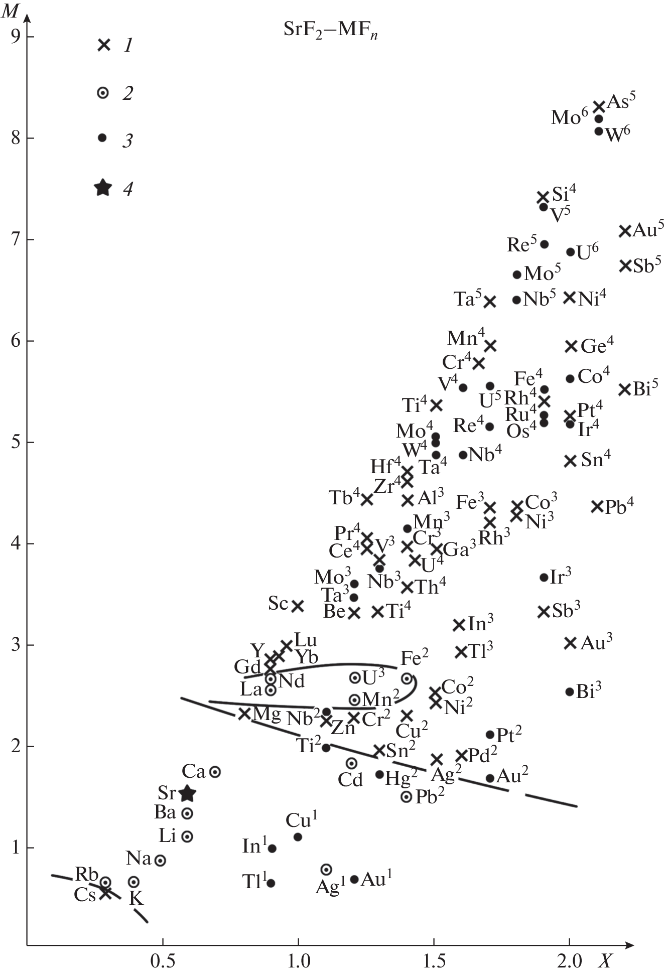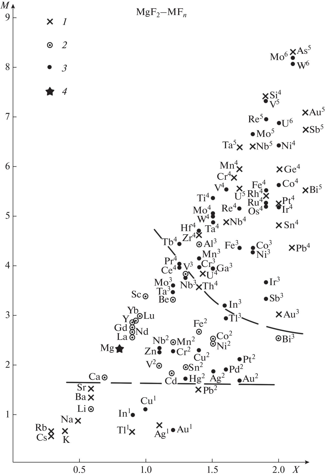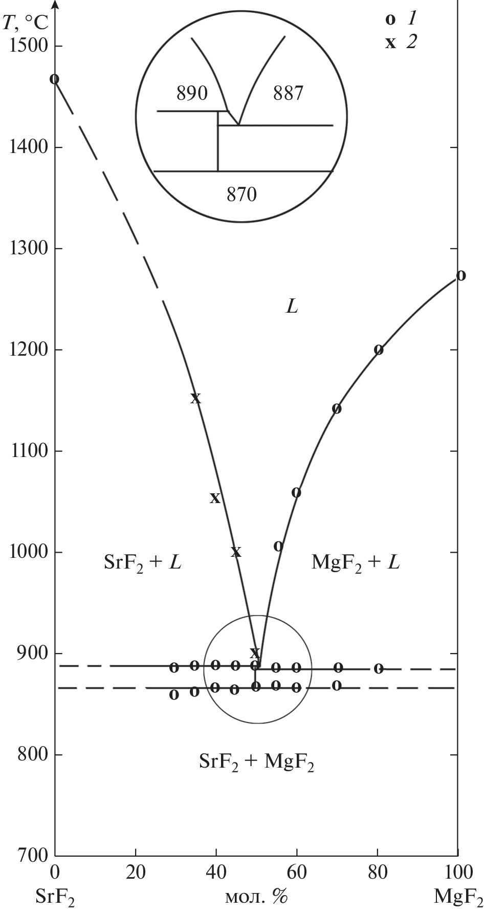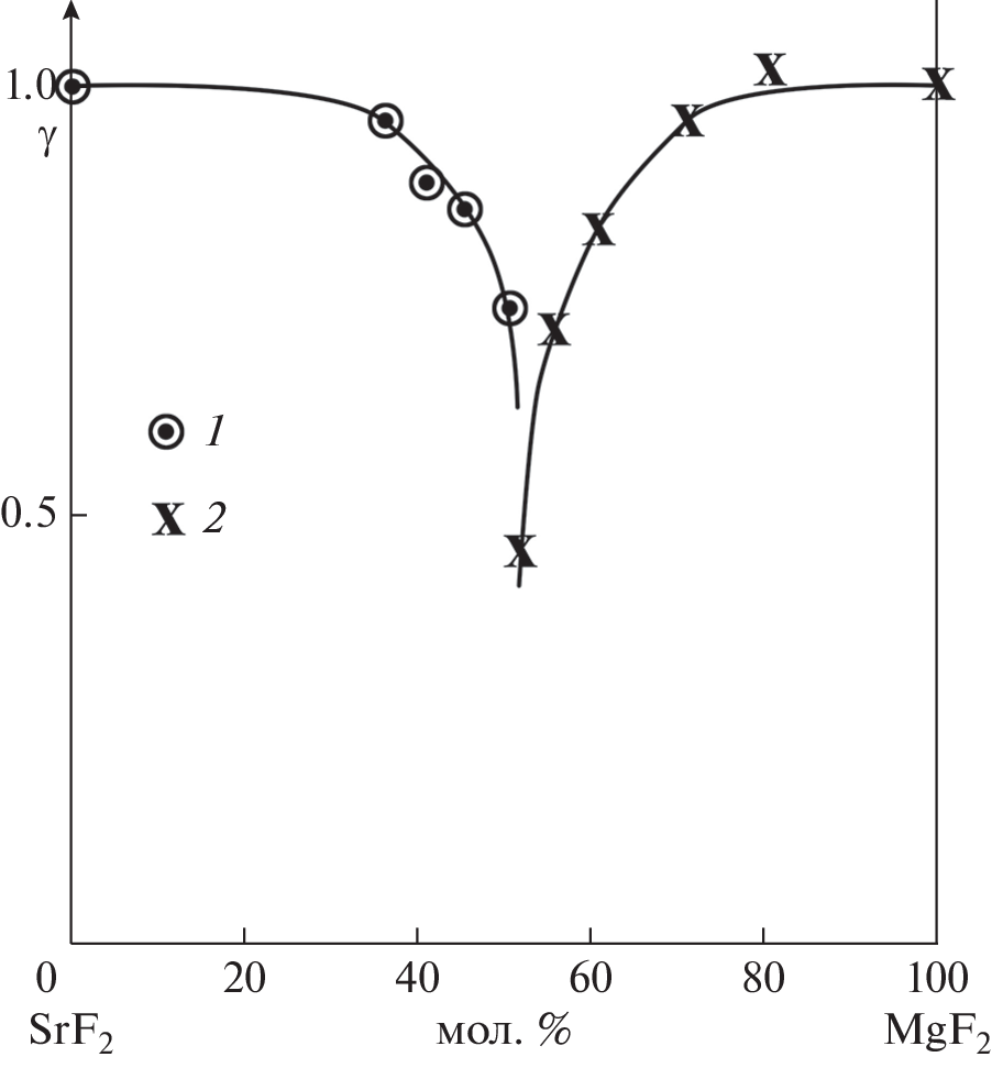The phase diagram of the SrF2–MgF2 system has been studied by differential thermal analysis (DTA) and X-ray powder diffraction (XRD). The stability area of the compound SrMgF4 is very small, and its extent is about 20°С between 870 and 890°С. The formation of compounds by magnesium fluoride and strontium fluoride with other metal fluorides is considered in the M versus X coordinates, where M is the cumulative moment of the cation and X is the cation electronegativity. Two areas of compound formation were identified for each of the fluorides. Magnesium and strontium fluorides are amphoteric compounds in terms of the Lewis acid and base theory.