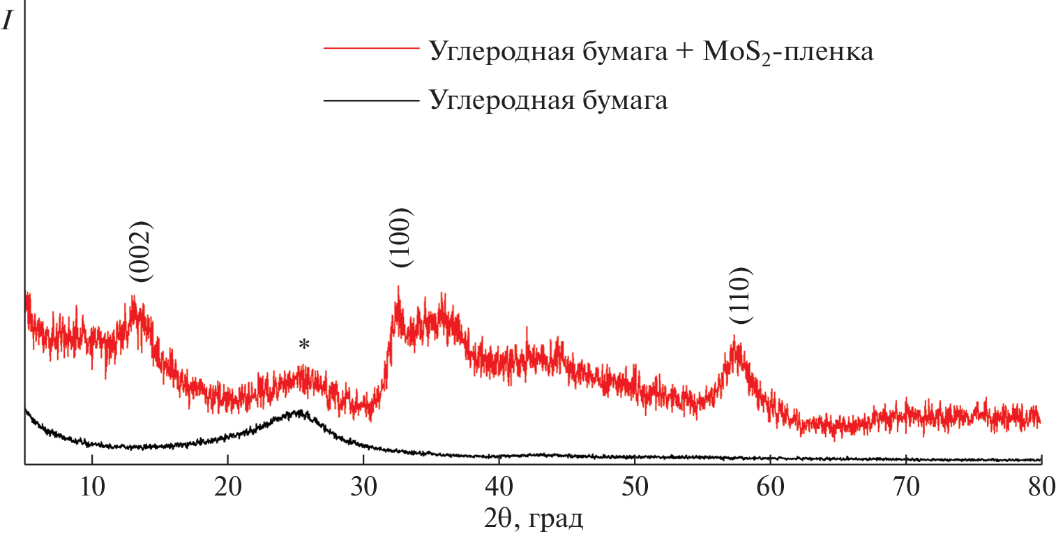 The formation of hierarchically organized MoS2 films on various substrates by a hydrothermal method was studied. The influence of synthesis conditions and the substrate (a glass or a flexible carbon paper substrate) on the crystal structure of sulfide films was determined using X-ray powder diffraction (XRD). Scanning electron microscopy (SEM) showed that the films on glass substrates comprised structurally different elements, namely a continuous dense layer of spherical nanoparticles on the surface of which hierarchically organized globular agglomerates of two types are arranged. A molybdenum disulfide shell about 1.5 μm thick, consisting of hierarchically organized nanosheets less than 10 nm thick, was formed on the surface of carbon fibers that make up the carbon paper. Elemental mapping was used to evaluate the homogeneity of the MoS2 film formed on the carbon paper. Atomic force microscopy (AFM) showed that an individual carbon fiber modified with a sulfide film had a mean square roughness of about 13 nm (over an area of about 100 μm2). According to Kelvin-probe force microscopy (KPFM) data, the electron work function of the material was 4.53 eV. The electrochemical characteristics of the manufactured flexible electrode based on a hierarchically organized molybdenum disulfide film were investigated. The specific capacitance and the stability of functional and microstructural properties of the manufactured supercapacitor electrode in 2000 charge–discharge cycles were evaluated. Thus, the proposed strategy is promising for the fabrication of efficient hierarchically organized MoS2 electrodes for flexible supercapacitors.