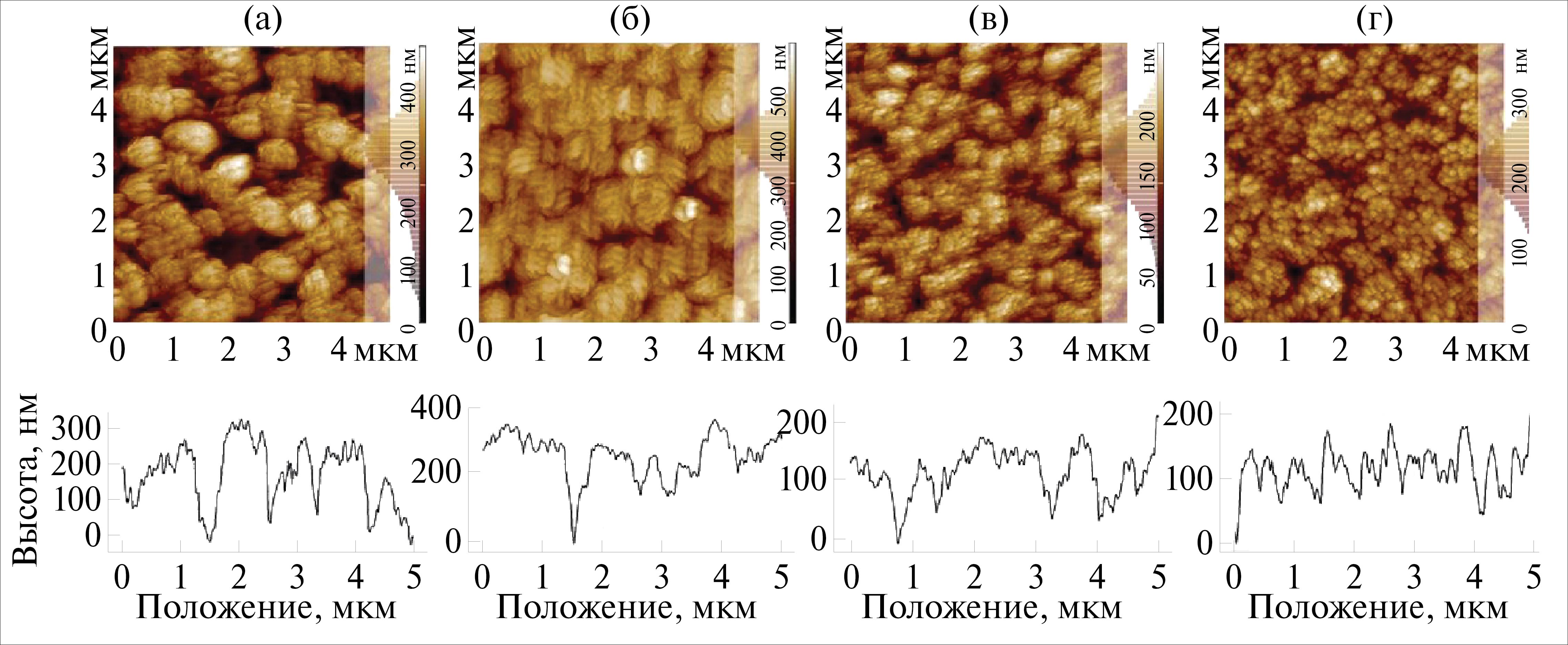 Рис. 5. Топология поверхности и профили поверхности по нормали, проведенные через центр изображения, тонких пленок SnS, полученных из водных растворов Na2S2O3 при 343 K на ситалловых подложках, в зависимости от длительности синтеза, мин: 30 (а), 60 (б), 90 (в), 120 (г). Размер АСМ-изображений 5 × 5 мкм2.