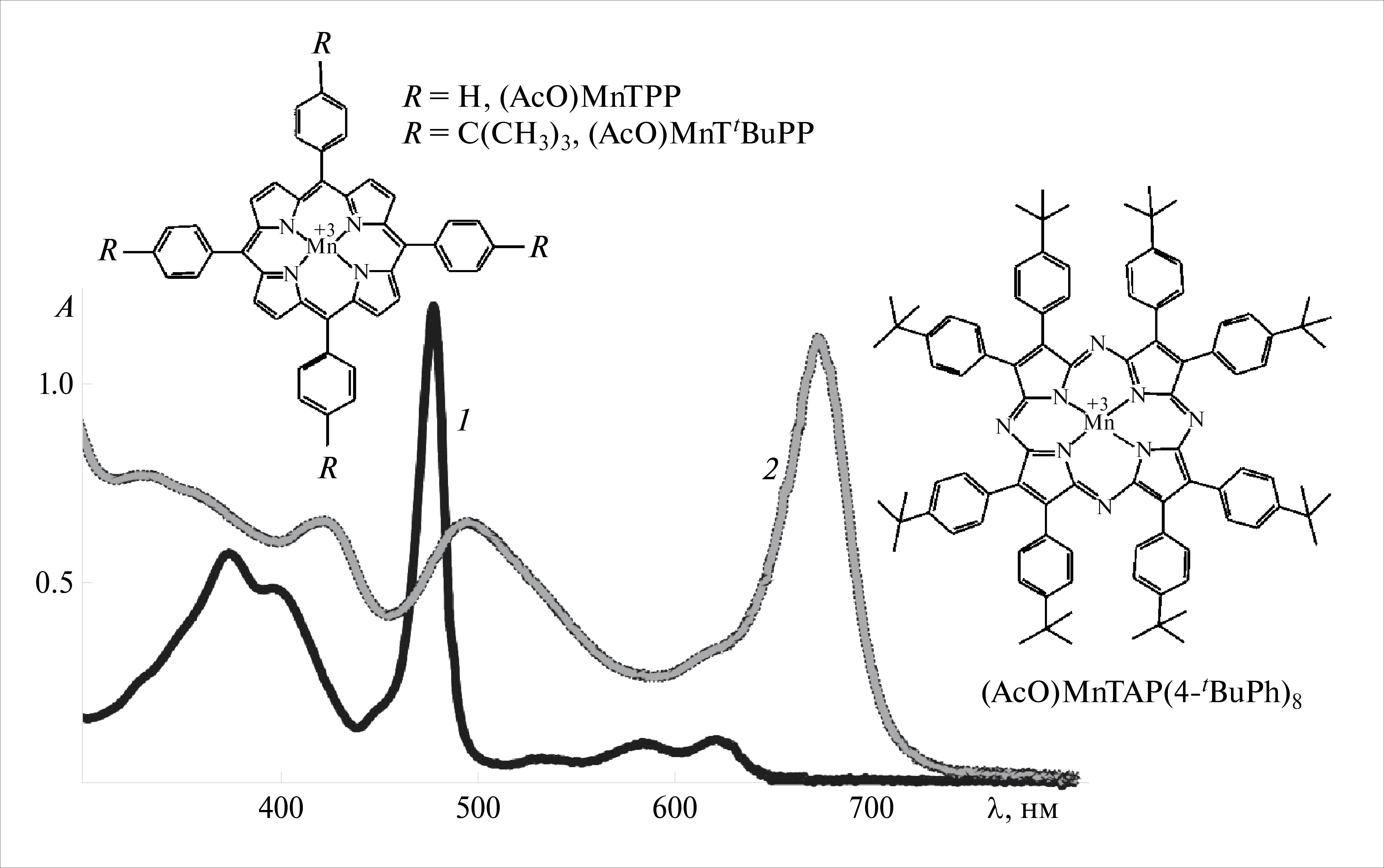 (AcO)MnTPP и (AcO)MnTtВuPP получены по реакции Mn(AcO)2 · 4H2O с соответствующим порфирином в кипящем диметилформамиде [31]. (AcO)MnTAP(4-tBuPh)8 синтезирован темплатной циклотетрамеризацией бис(4-трет-бутилфенил)фумаронитрила с ацетатом марганца(II) в среде 2-диметиламиноэтанола при 150°C [32]. Идентификацию и контроль степени чистоты комплексов проводили по электронным, ИК- и MALDI-TOF масс-спектрам.