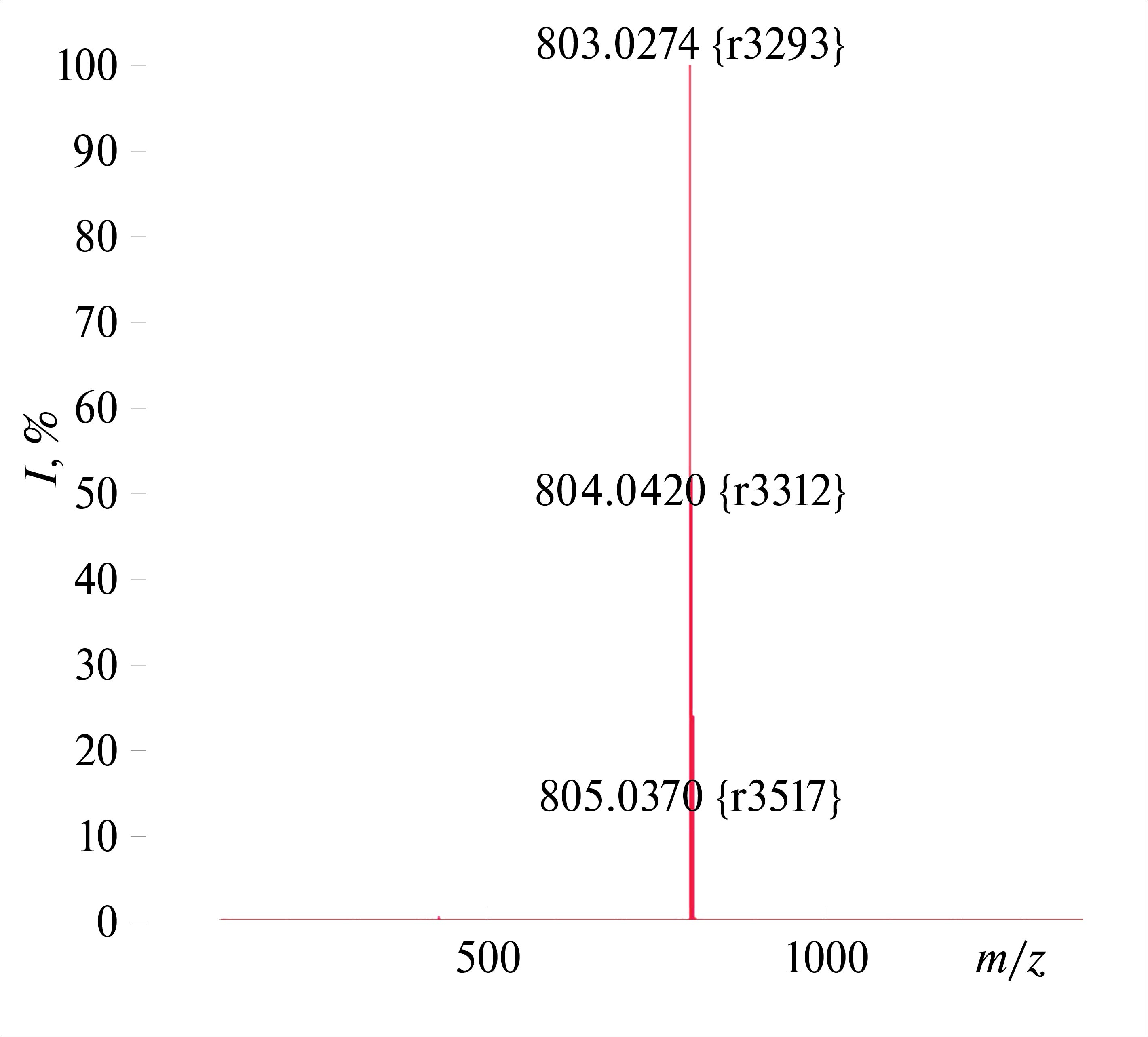 Рис. 3. Масс-спектр марганец-5,10,15-три-(4-нитрофенил)-20-фенилпорфирина.