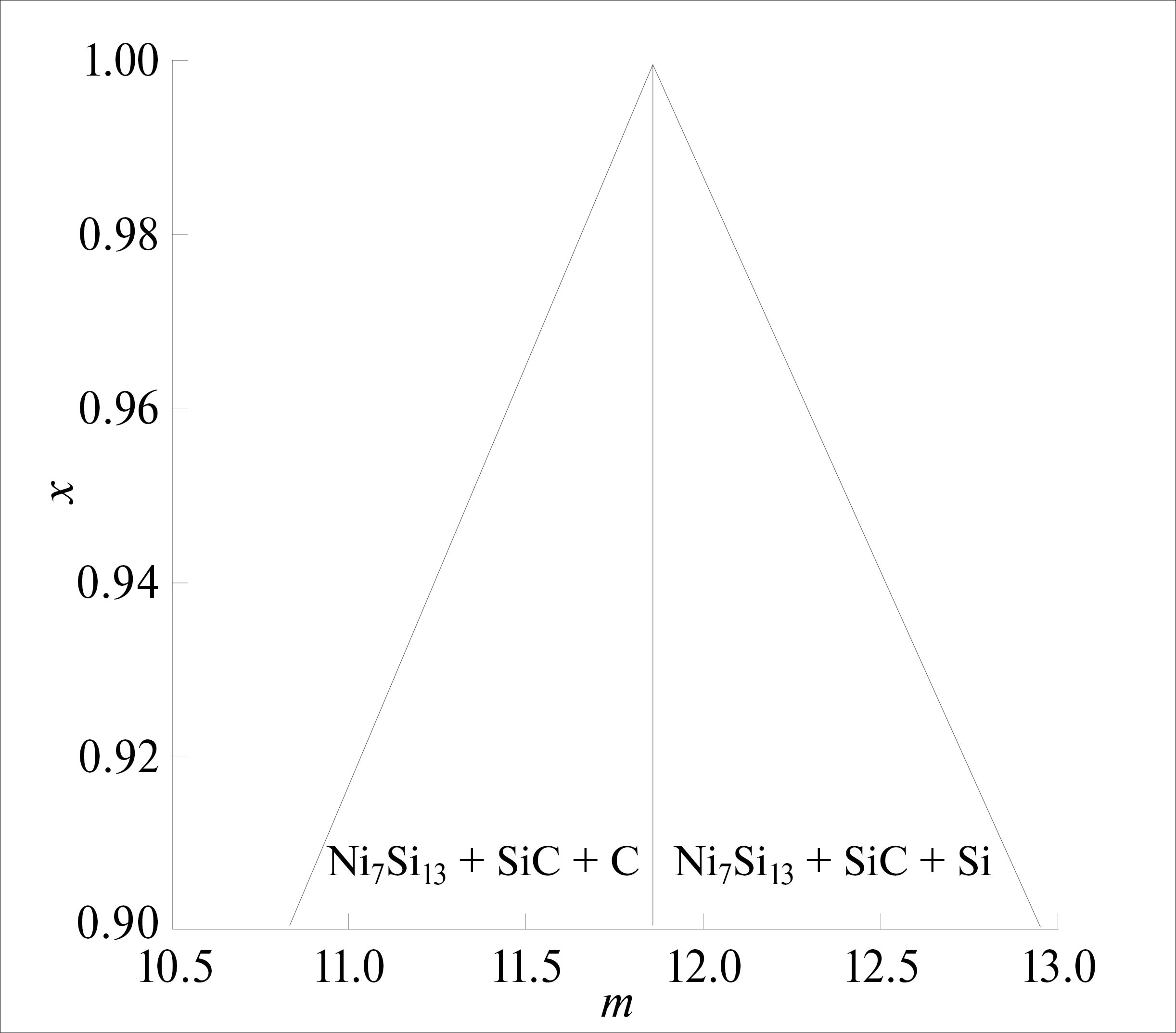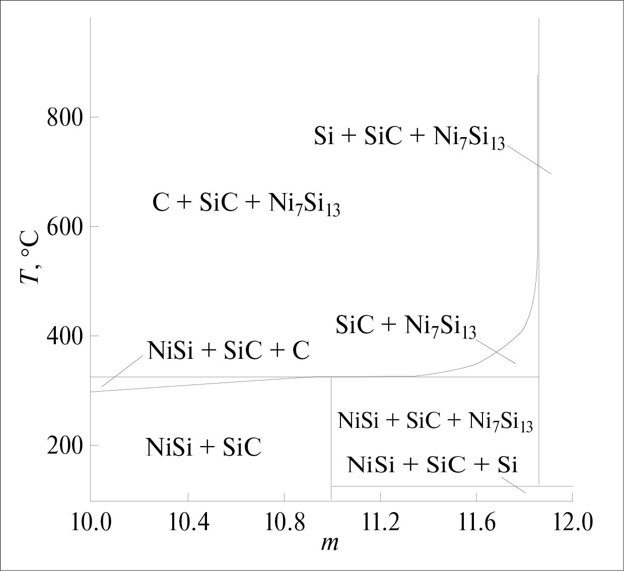 - при соответствующих условиях в этих системах образуются фазовые комплексы NiSi + SiC, NiSi + SiC + C, NiSi + SiC + Ni7Si13, NiSi + SiC + Si, SiC + Ni7Si13 и Si + SiC + Ni7Si13;