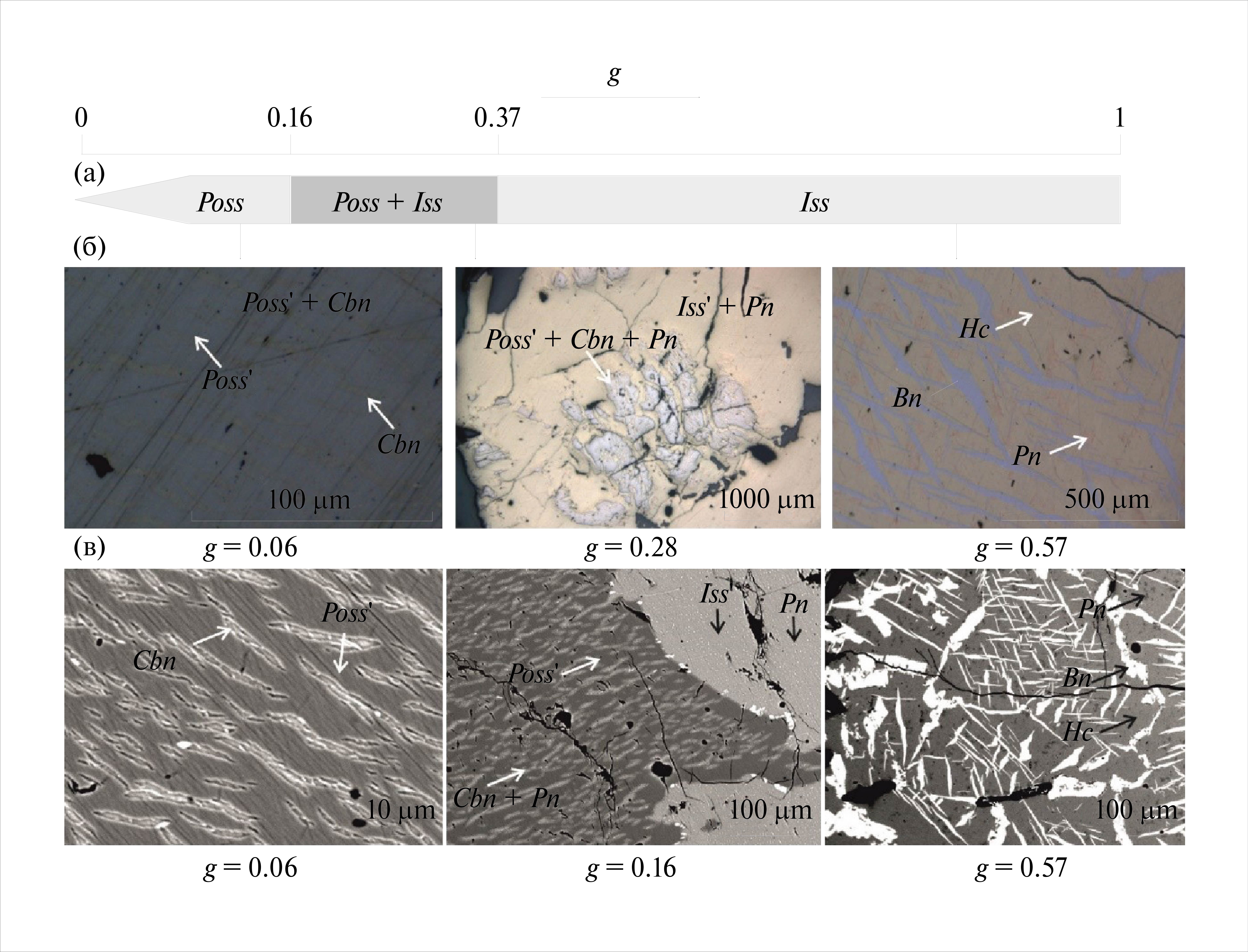 Первая зона (0 ≤ g ≤ ~ 0.16) состояла из первичного пирротинового твердого раствора (Poss). В работах по исследованию системы Cu–Fe–S эту фазу обычно именуют пирротиновый твердый раствор, а в системах Fe–Ni–S и Cu–Fe–Ni–S называют моносульфидным твердым раствором. В дальнейшем мы будем пользоваться первым наименованием.