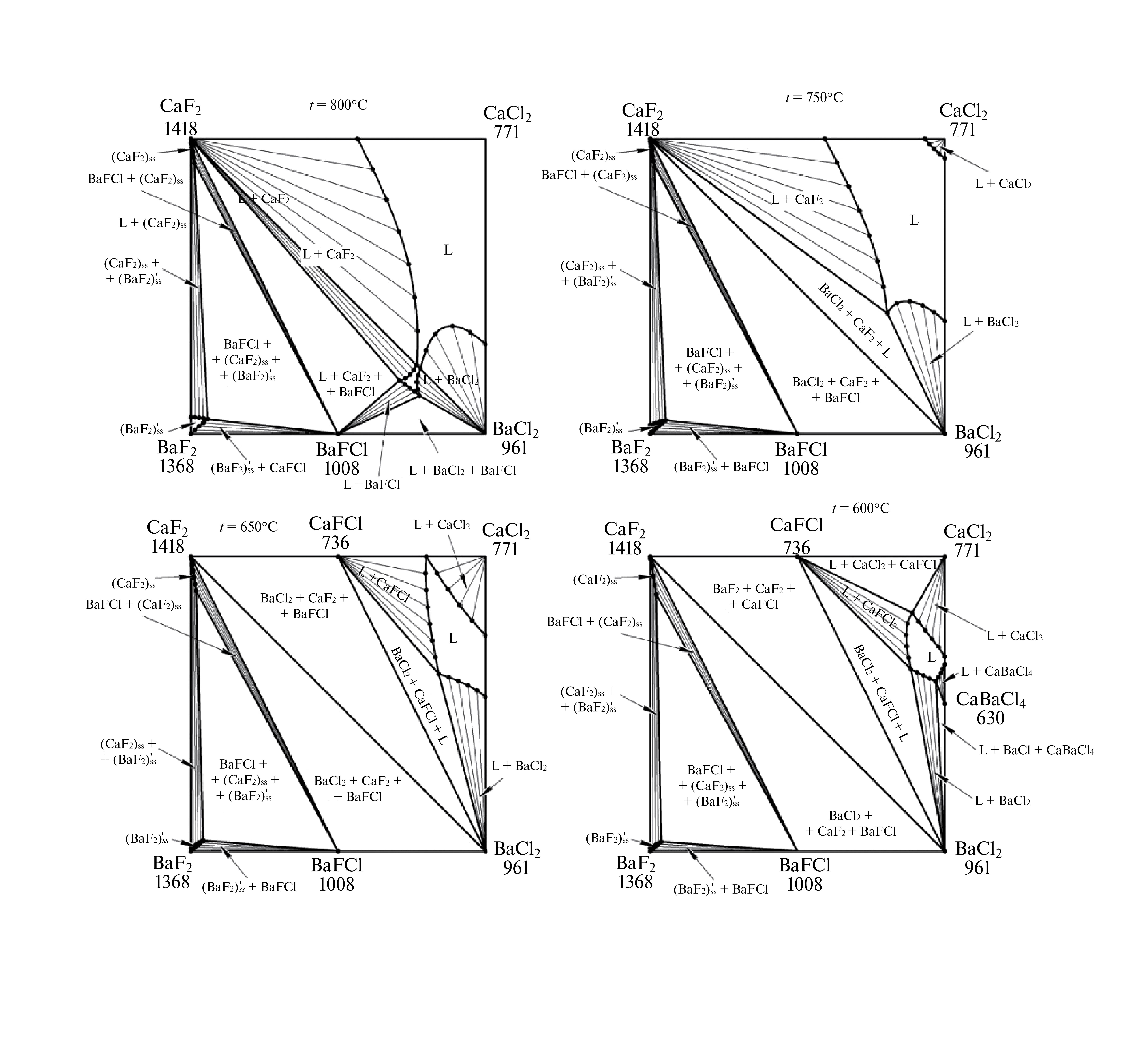 Рис. 5. Изотермические сечения системы Ca,Ba | | F,Cl при 800, 750, 650 и 600 °С, полученные из модели.