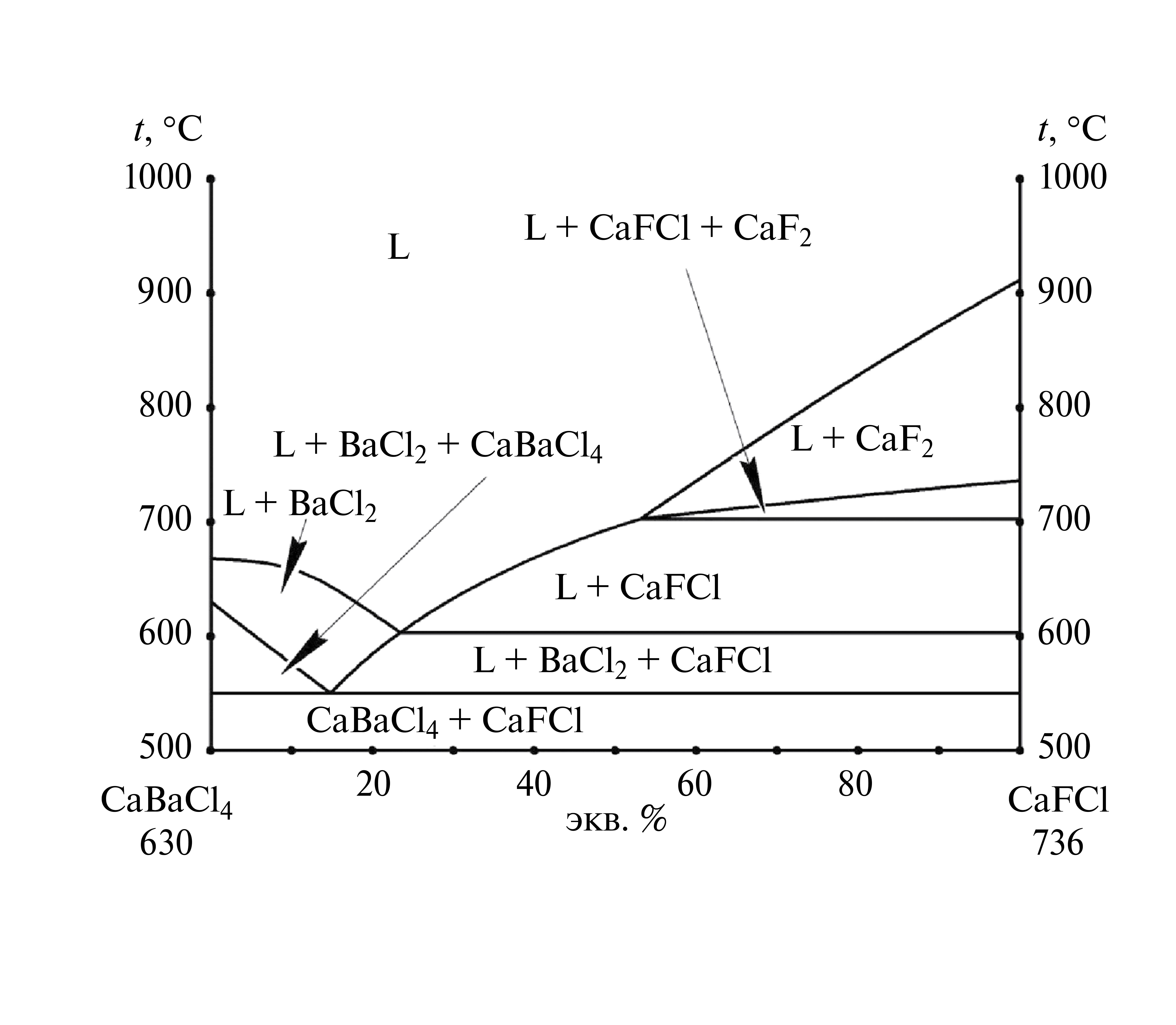 Рис. 7. Политермический разрез секущей CaBaCl4–CaFCl системы Ca,Ba | | F,Cl, полученный из модели.
