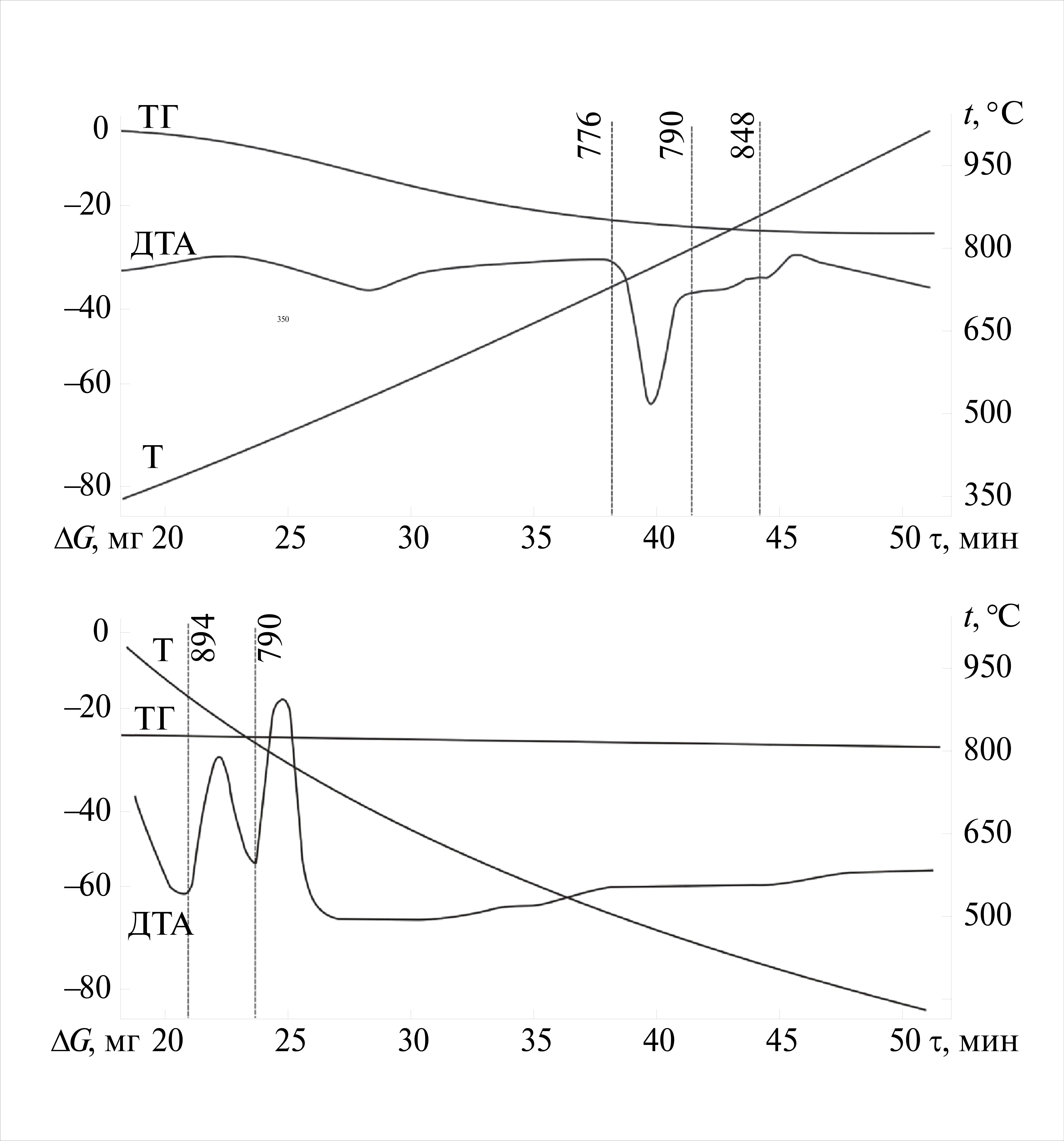 Для составов á (CaF2 — 25%, BaF2 — 15%, BaCl2 — 60%) и â (CaF2 — 10%, BaF2 — 30%, BaCl2 — 60%) (фигуративные точки нанесены на рис. 2) осуществлен прогноз температур фазовых превращений при кристаллизации. Также для фигуративных точек á и â сняты кривые T, ДТА и ТГ (рис. 6, 7). В табл. 1 представлены теоретические и экспериментальные значения данных температур, а также схемы реакций фазовых превращений. Относительные отклонения теоретических (спрогнозированных с помощью 3D-модели) и экспериментальных температур рассчитаны по формуле:
