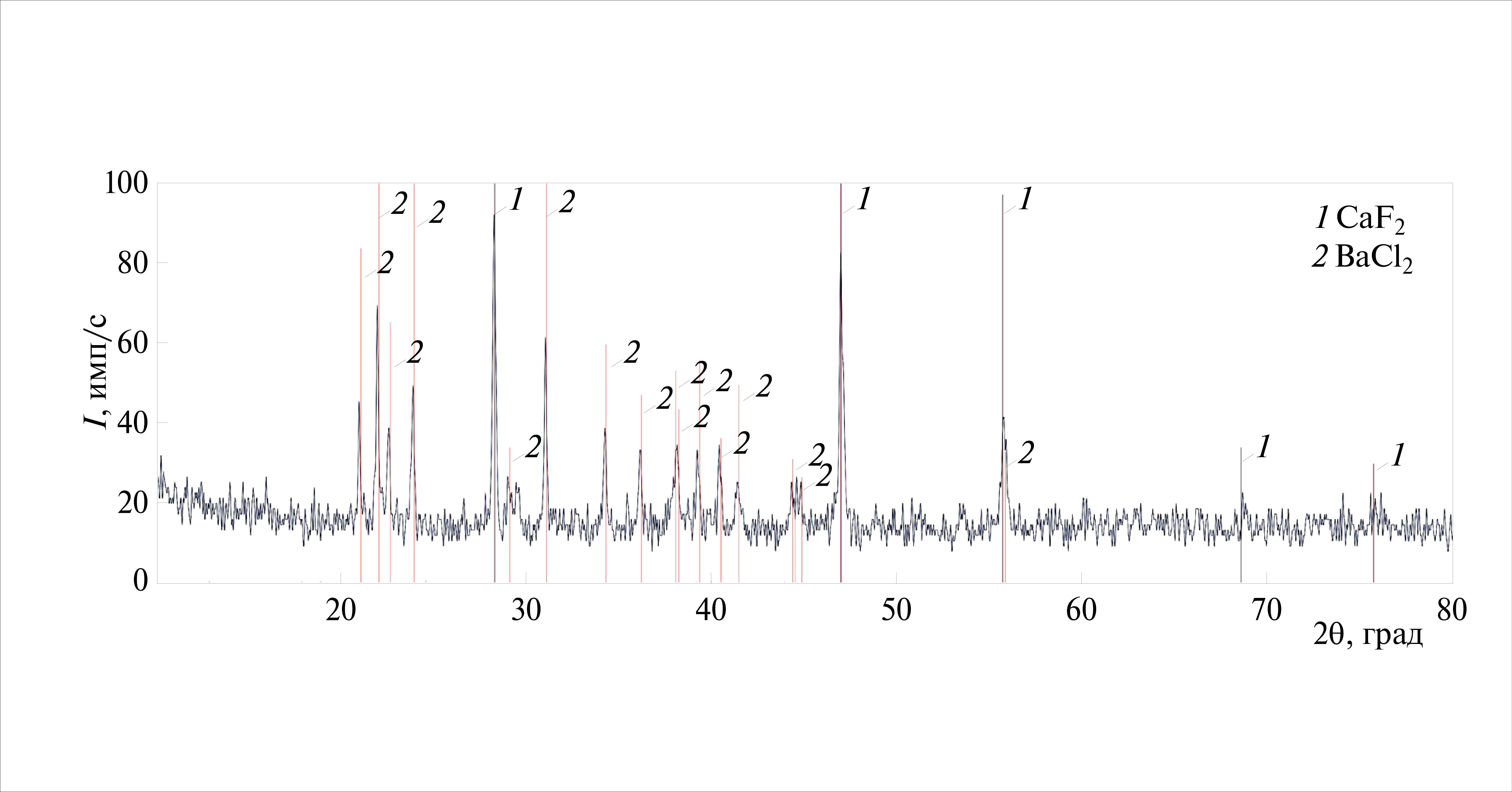Рис. 10. Рентгенограмма образца состава 22.5% CaF2 + 77.5% BaCl2 (CaF2 PDF 00-002-1302; BaCl2 PDF 01-072-0368).