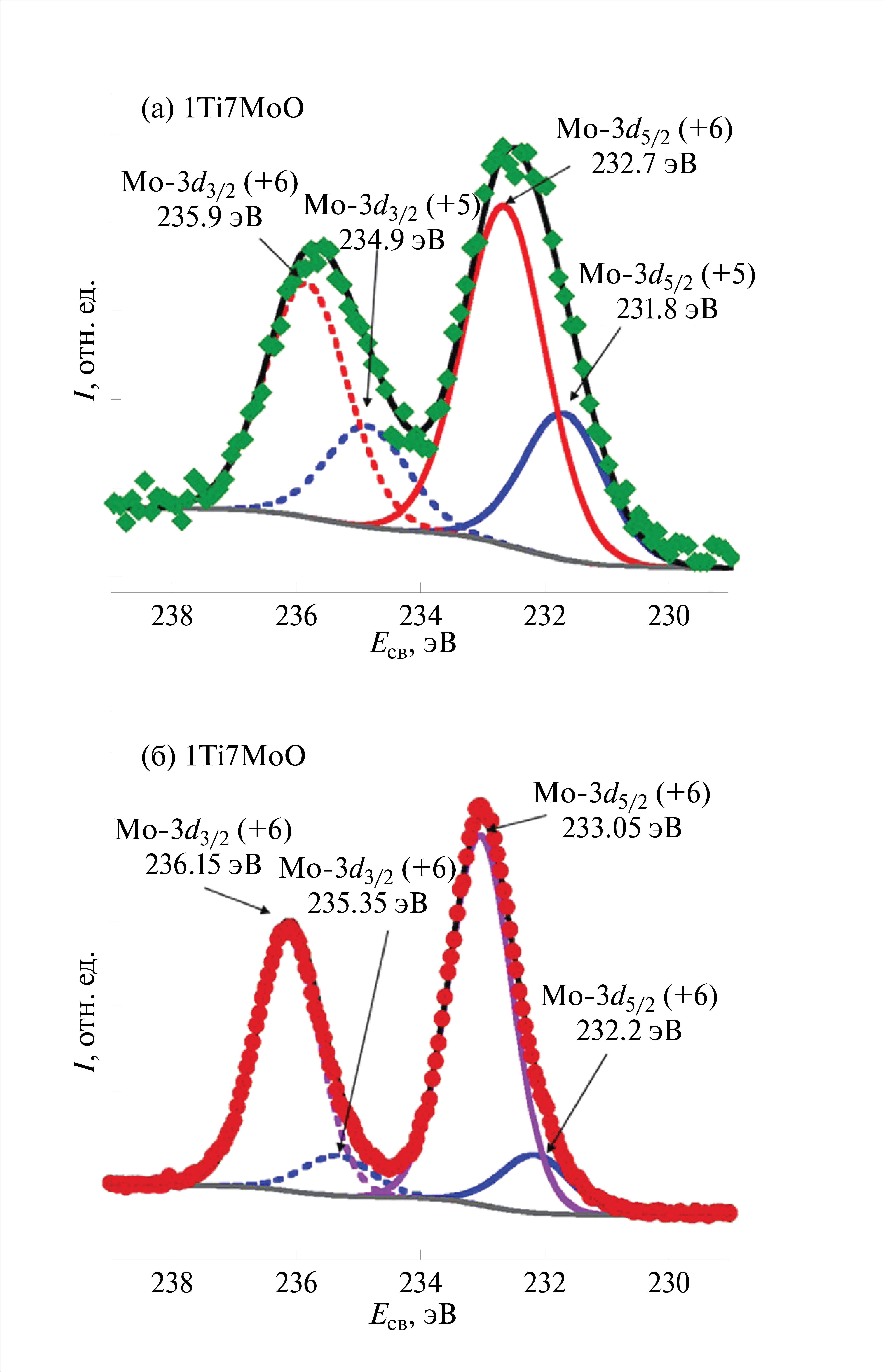 Спектральные данные и модели линий остовного уровня Mo 3d для пленок 1Ti1MoO и 1Ti7MoO представлены на рис. 4а и 4б соответственно. Для пленки 1Ti1MoO Mo3d5/2 можно разложить на два пика с энергиями связи 232.7 и 231.8 эВ, что согласуется с литературными данными для Mo+6 [38] и Mo+5 [38] соответственно. Также для данной пленки Mo3d3/2 разложили на два пика с энергиями связи 235.9 эВ (Mo+6) [49] и 234.9 эВ (Mo+5) [50].