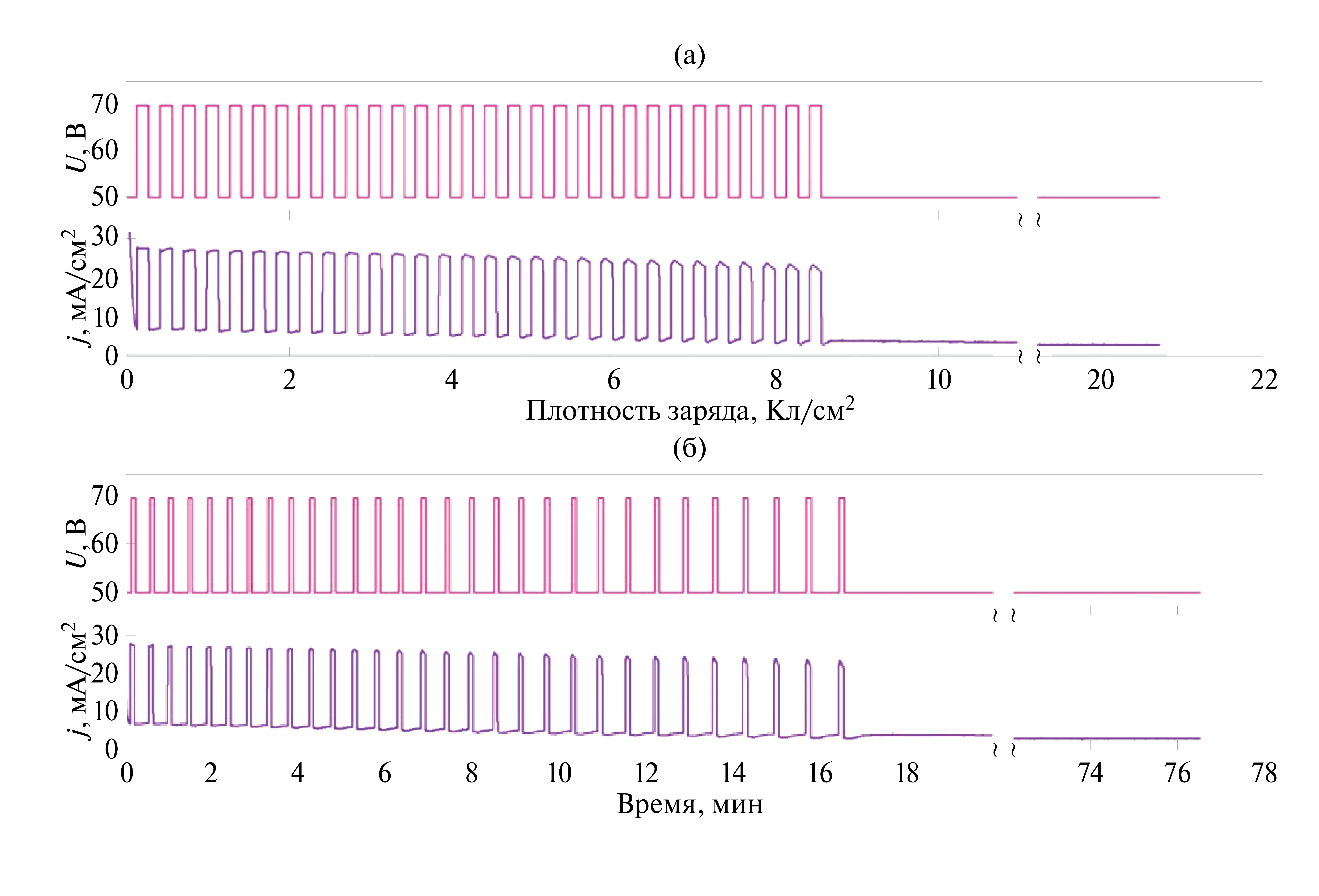 На рис. 1 представлены типичные зависимости прикладываемого напряжения (U) и регистрируемой плотности тока ( j ) от плотности заряда и времени анодирования в процессе синтеза ФК на основе АОТ. На этапе формирования фотонно-кристаллической части образца при ступенчатом изменении напряжения в диапазоне 50–70 В наблюдается периодическое изменение j, а при электрохимической постобработке ФК при постоянном напряжении 50 В плотность тока постепенно падает с 4.2 до 3.2 мА/см2.