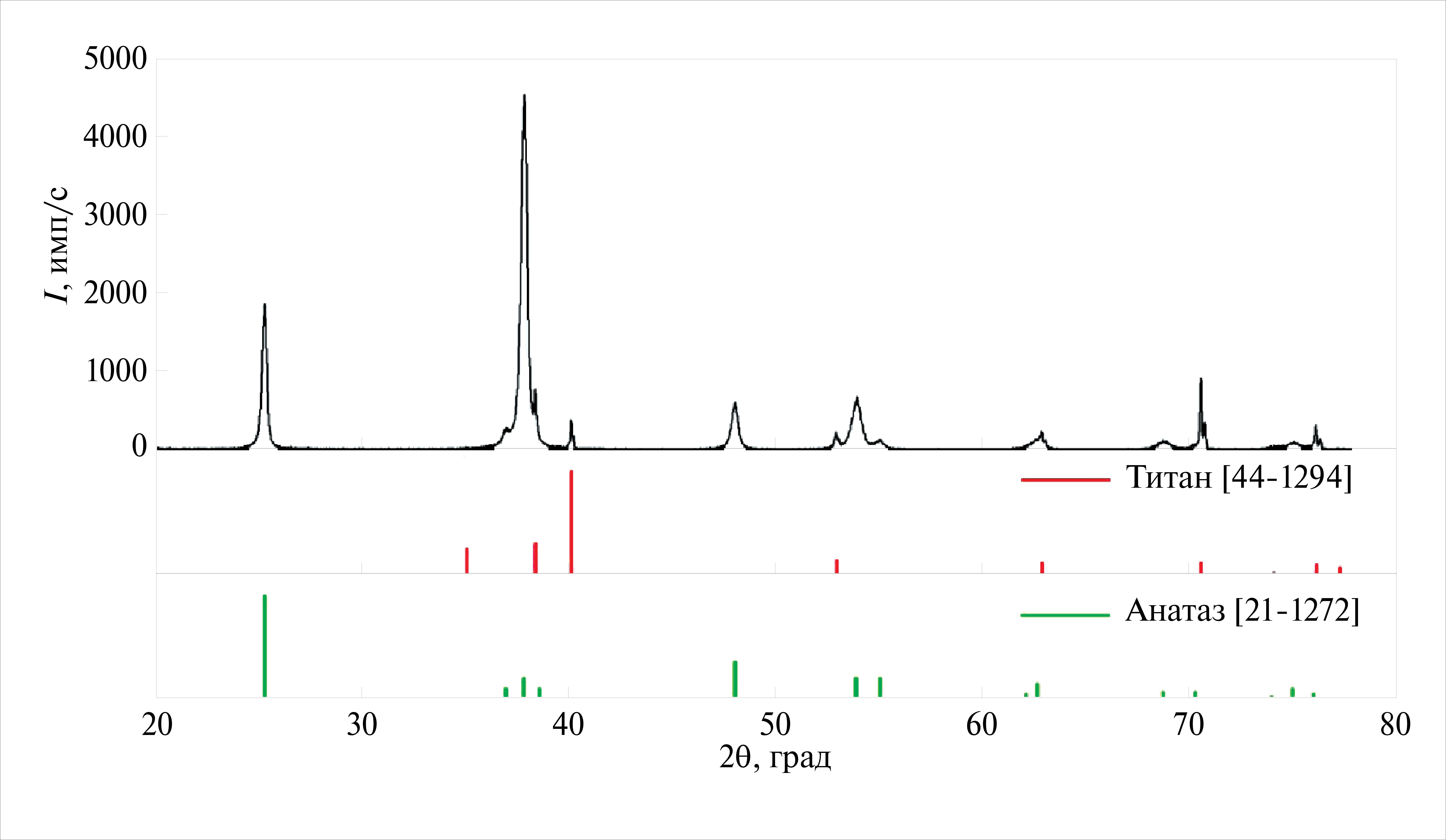 Рис. 2. Рентгенограмма отожженного образца S1065 на титановой подложке. В нижней части рисунка приведены положения и относительная интенсивность рефлексов титана [44–1294] и анатаза [21–1272] из базы данных ICDD PDF2.