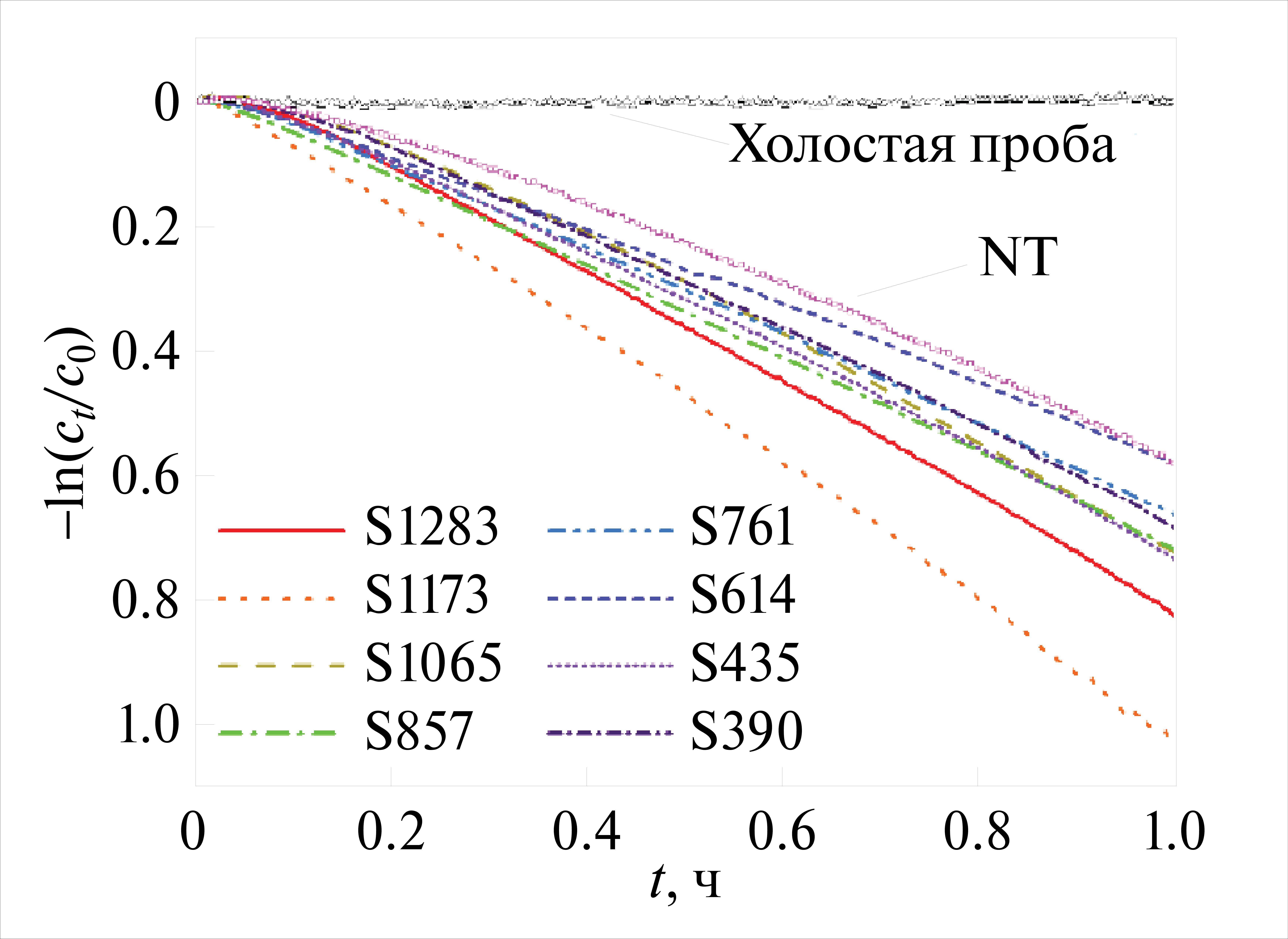 Рис. 6. Кинетические кривые фоторазложения метиленового синего под действием УФ-излучения (365 нм) в присутствии отожженных ФК на основе АОТ с различным положением ФЗЗ (390–1283 нм), а также отожженного образца NT, полученного при постоянном напряжении 60 В. В качестве холостой пробы выступала алюминиевая фольга.