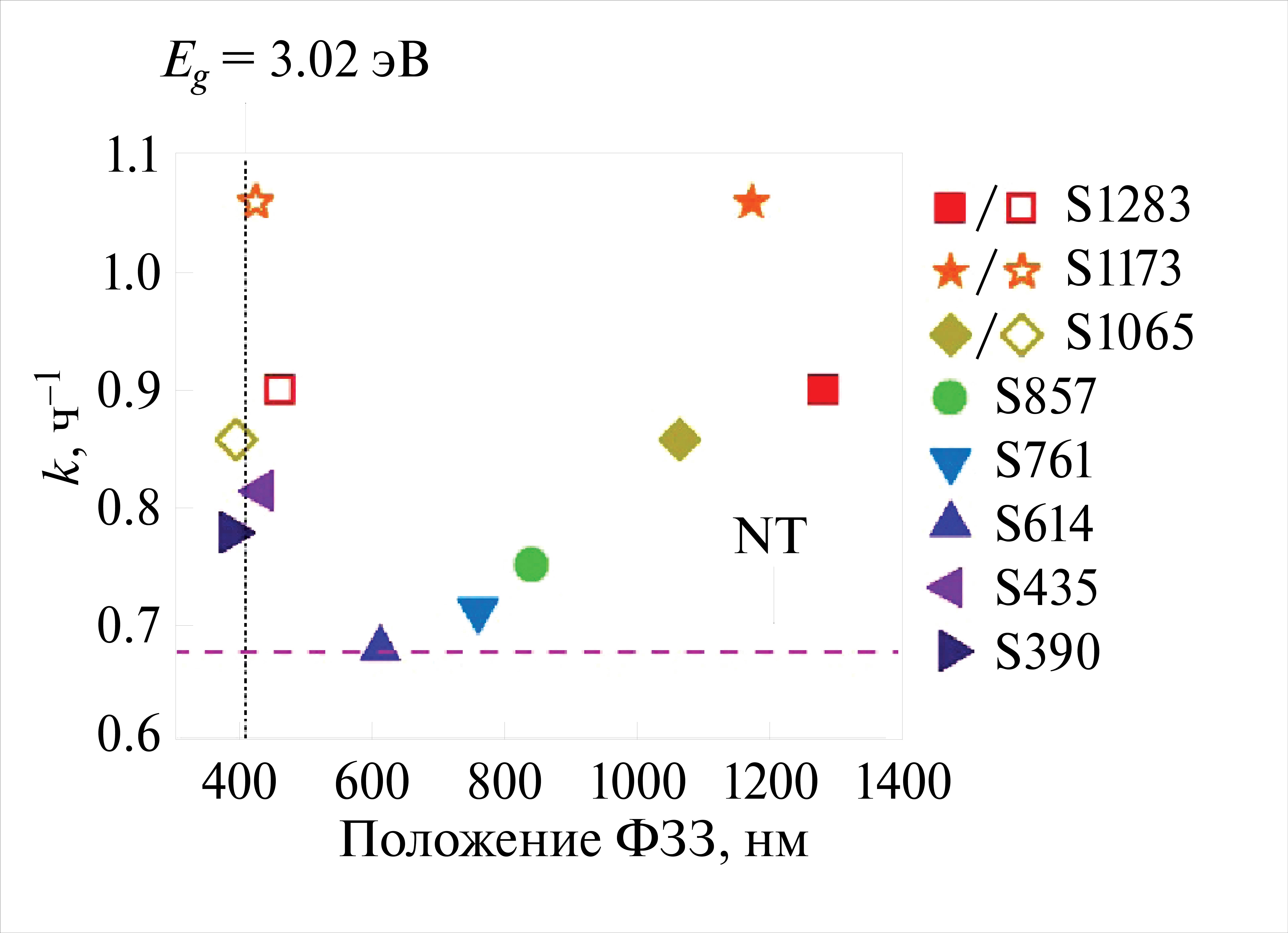 Зависимость k от положения максимума ФЗЗ фотокатализатора показана на рис. 7. Константы скорости реакции разложения МС для всех образцов ФК больше, чем для образца NT, не обладающего периодической структурой. Значение k = 0.677 ч–1 для образца NT обозначено горизонтальной пунктирной линией. Образцы ФК S1283, S1173, S1065, S435 и S390, у которых максимум ФЗЗ (первого или третьего порядка) находится в спектральной области, близкой к рассчитанному значению края собственного поглощения диоксида титана (Eg = 3.02 эВ, показано вертикальной пунктирной линией на рис. 7), демонстрируют более высокую фотокаталитическую активность, по сравнению с ФК, максимум отражения которых расположен дальше от этого значения (образцы S614, S761 и S857). При этом образцы S1283, S1173, S1065, обладающие ФЗЗ третьего порядка вблизи Eg, несмотря на ее меньшую интенсивность, демонстрируют более высокую фотокаталитическую активность в отношении фоторазложения МС, по сравнению с образцами S435 и S390, которые характеризуются наличием интенсивной ФЗЗ первого порядка в том же спектральном диапазоне. В частности, наибольшая фотокаталитическая активность наблюдается для образца ФК S1173, для которого максимум ФЗЗ первого порядка находится на длине волны 1173 нм, а третьего порядка — на длине волны 426 нм. Константа скорости реакции разложения МС для этого ФК составляет 1.061 ч–1, что в 1.6 раз выше значения k для образца NT. Наименьшим значением k = 0.679 ч–1, сравнимым с константой скорости разложения МС на образце NT, характеризуется образец S614, для которого максимум ФЗЗ первого порядка находится на длине волны 614 нм.