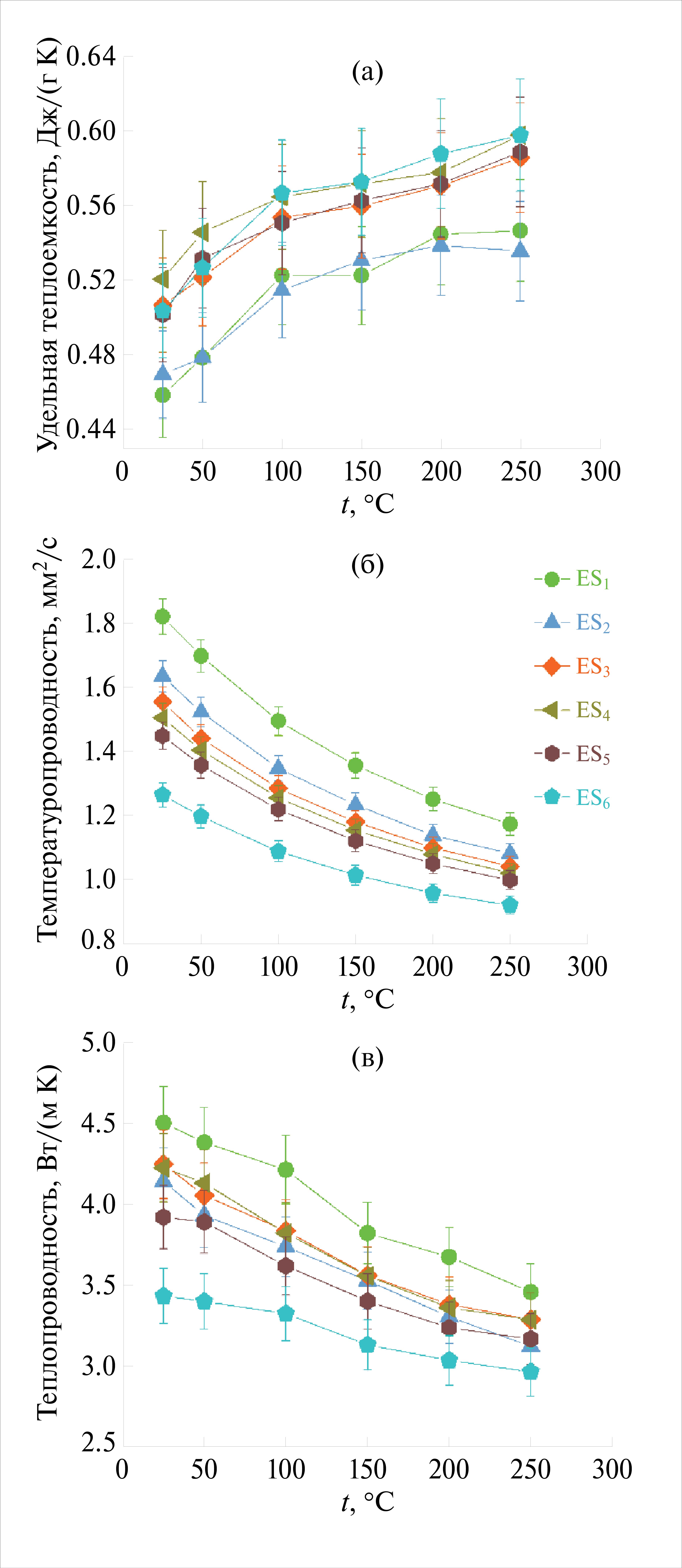 Удельная теплоемкость всех образцов монотонно увеличивается с ростом температуры (рис. 5а), а ее значения лежат в диапазоне 0.46–0.52 Дж/(г K) при 25°C и 0.54–0.60 Дж/(г K) при 250°C. Следует отметить, что диапазон величин удельной теплоемкости всех образцов достаточно узок и в целом не превышает величины погрешности измерений данной величины. Тем не менее можно говорить о некоторой концентрационной зависимости теплоемкости, а также о зависимости температуро- и теплопроводности от содержания скандия: свойства образцов ES1 и ES6 занимают крайние значения (рис. 5), что коррелирует с минимальным и максимальным содержанием в них скандия (z = 0.4 и 1.7).