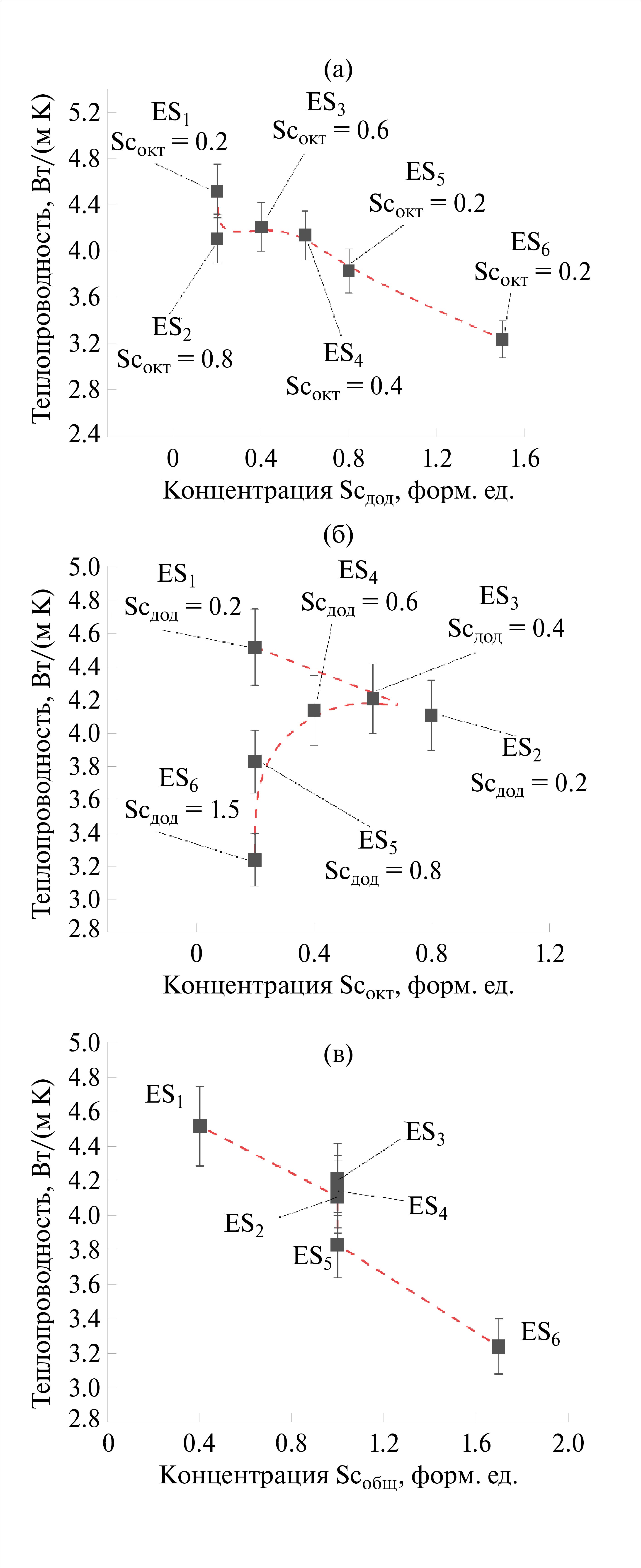 Как и в случае температуропроводности, наибольшее значение коэффициента теплопроводности показал образец ES1 (4.52 Вт/(м K)), а наименьшее – образец ES6 (3.24 Вт/(м K)). Таким образом, наблюдается аналогичное уменьшение величины теплопроводности с увеличением общей концентрации скандия в составе твердого раствора. Зависимость теплопроводности от концентрации скандия в различных позициях решетки граната представлена на рис. 6.