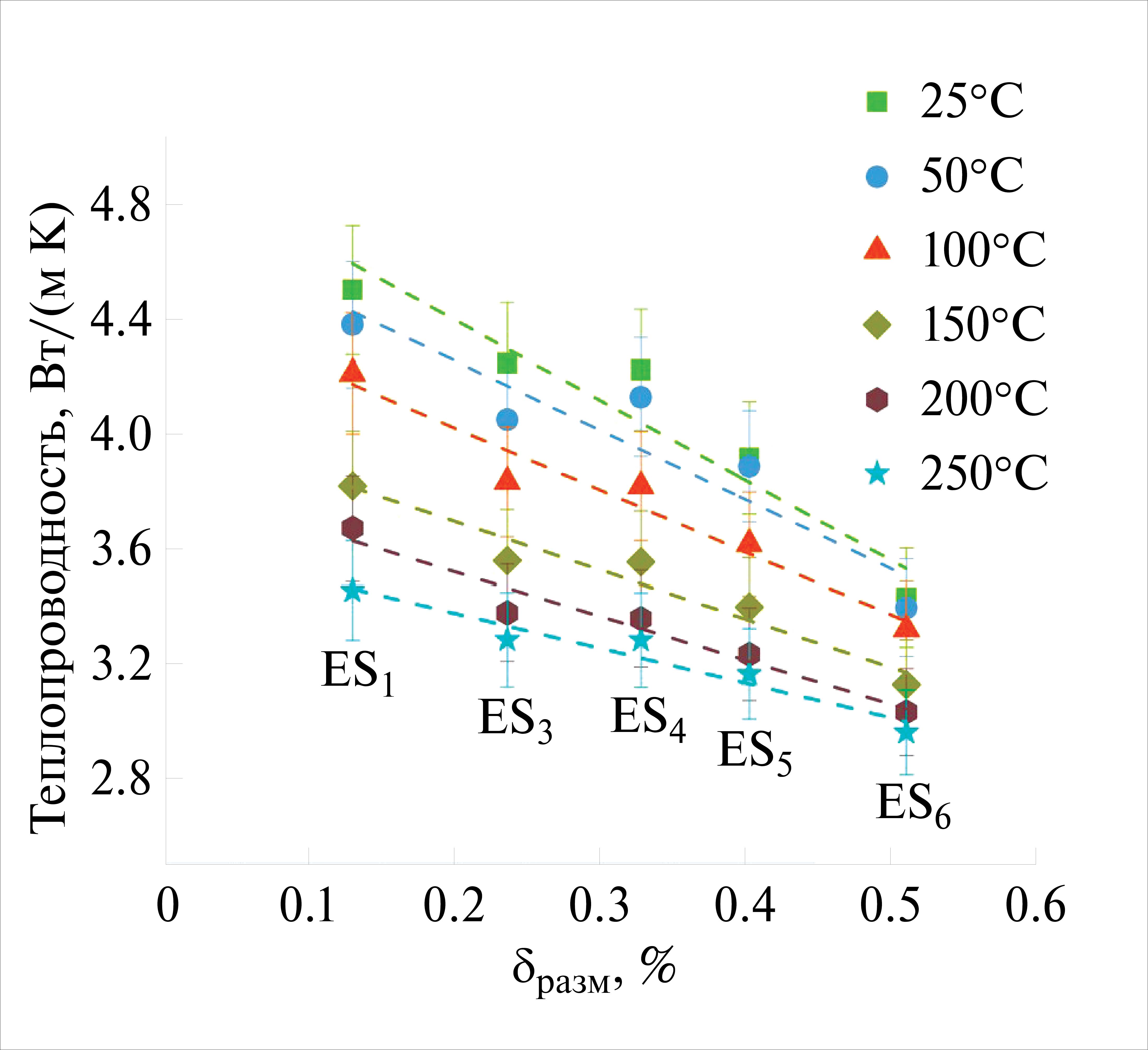 Величина коэффициента äразм (рис. 7) показывает отрицательную корреляцию с измеренной величиной теплопроводности, что свидетельствует в пользу влияния структурного разупорядочения на снижение коэффициента теплопроводности. Аналогичные результаты были получены при исследовании теплопроводности высокоэнтропийной керамики на основе редкоземельных цератов [33] и пирохлорных оксидов [34].