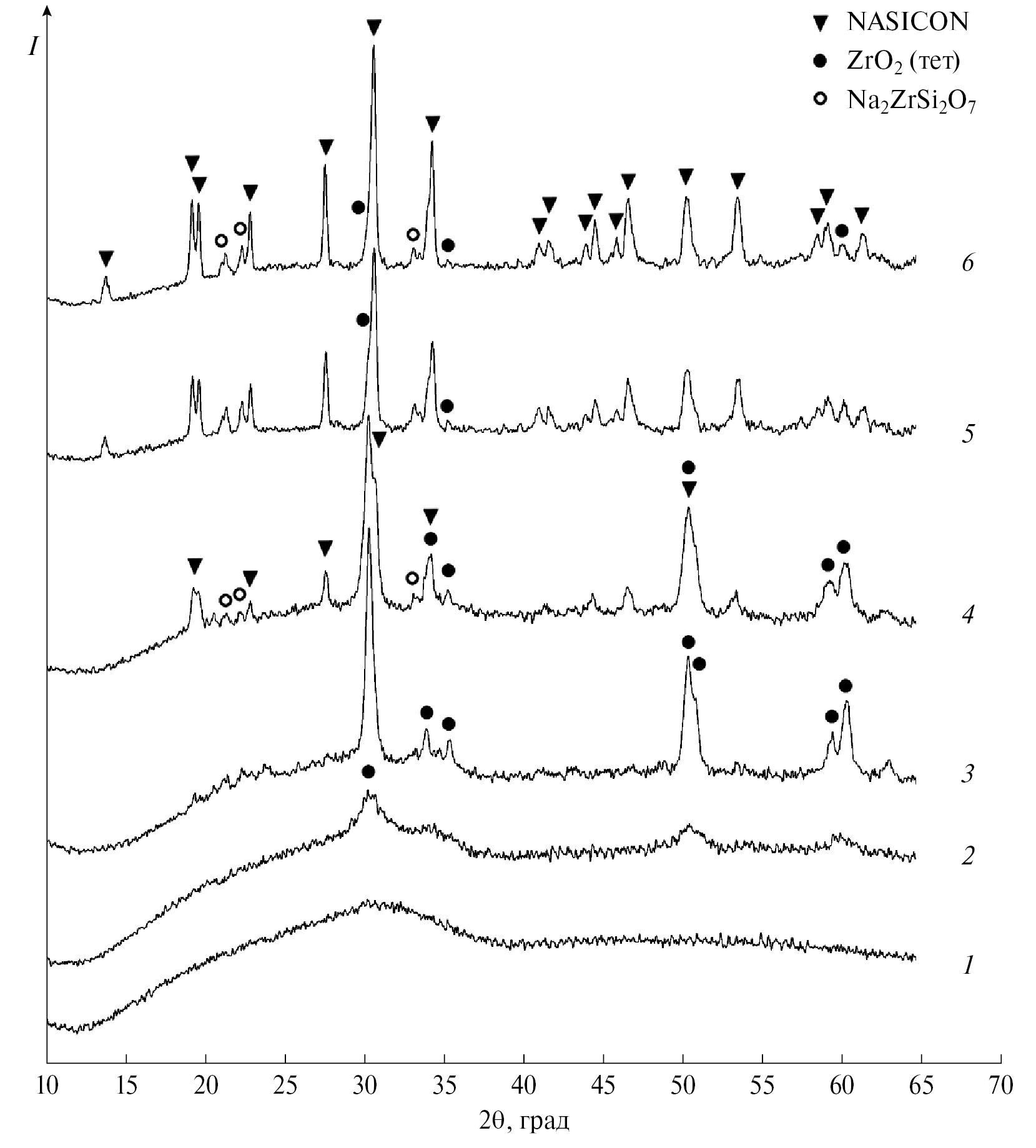 Смешивание исходных компонентов в стехиометрических количествах для получения Na3Zr2Si2PO12 и последующий обжиг приводят к следующим фазовым превращениям (рис. 1): при 600°С образец рентгеноаморфный; при 700°С образуется кристаллическая фаза тетрагонального ZrO2; при 900°С к имеющейся фазе добавляются NASICON и паракелдышит (Na2ZrSi2O7). С увеличением температуры обжига от 900°С содержание ZrO2 в продукте синтеза уменьшается и в интервале 1100–1200°С становится незначительным. Таким образом, тетрагональная фаза ZrO2, скорее всего, является промежуточным продуктом формирования фазы NASICON. Тем не менее присутствие остаточных количеств ZrO2 и паракелдышита говорит о нарушении стехиометрии в прекурсоре. Возможно, образование паракелдышита происходит по причине частичных потерь фосфора в виде фосфорного ангидрида или обусловлено другими факторами, например участием в образовании рентгеноаморфной фазы. Известно [11], что дополнительные количества P-содержащего компонента, а также увеличение Na в присутствии избытка P способствуют удалению Na2ZrSi2O7 и тетрагонального ZrO2 из продукта синтеза. Для изучения влияния сверхстехиометрических количеств на состав продукта получены образцы, содержащие дополнительные количества Na (5, 10, 15, 20 мол. %) и P (15, 20, 25, 30, 35 мол. %). Интерес представляет не только изменение состава получаемых продуктов в зависимости от соотношения компонентов, но и от температуры обжига.