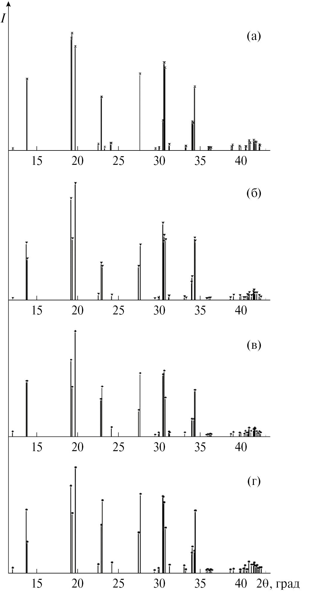 Рис. 2. Штрихрентгенограммы: PDF 01-084-1317 (х = 2.12) (а); PDF 01-084-1200 (х = 2) (б); PDF 01-084-1182 (х ~ 1.9) (в), PDF 01-078-0489 (х ~ 1.84) (г).