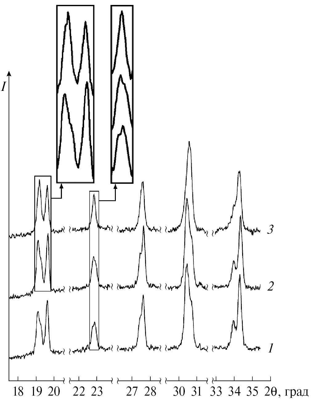 Рис. 3. Основные дифракционные максимумы образцов, полученных при температурах обжига, °С: 1200 (образец 4) (1), 1200 (образец 10) (2), 1000 (образец 8) (3).