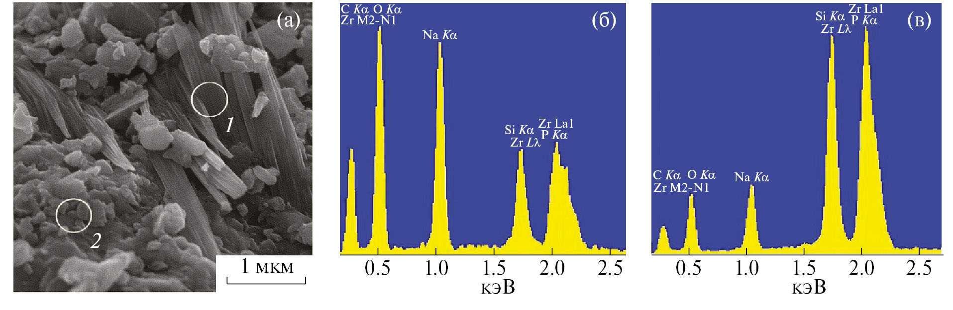 Периодически в литературе встречается информация о потерях Na в процессе синтеза NASICON вследствие испарения [10, 14]. В действительности соединения натрия не являются летучими. Необходимость добавления его сверх стехиометрических количеств, скорее всего, связана с образованием рентгеноаморфной фазы, а также других соединений, незначительных по содержанию и не обнаруживаемых РФА. Так, методом электронной микроскопии в некоторых образцах установлено присутствие нетипичных для NASICON кристаллов с формой уплощенных призм, средний размер которых составляет 0.2 × 0.5 × 2 мкм. Наблюдается неравномерность распределения кристаллов в образце: в основном это единичные кристаллы (рис. 5в), но встречаются и скопления (рис. 7а). Энергодисперсионные спектры выявляют существенно большее количество Na в их составе (рис. 7б) по сравнению с основной фазой (рис. 7в). Принадлежность кристаллов к определенному соединению затруднительна ввиду спектрального рассеяния от прилегающих зон. Указанная примесная кристаллическая фаза находится вне пределов обнаружения РФА, поэтому ее количество несущественно. Следует отметить, что эти кристаллы обнаружены только в образцах, отожженных при температуре 1200°С. Увеличение стеклофазы в образце с повышением температуры обжига материала (рис. 5) и одновременное уменьшение количества Na и P в кристаллической фазе NASICON, обнаруженное при температуре 1100°С, — еще один аргумент в пользу участия этих элементов в основном в образовании рентгеноаморфной фазы.