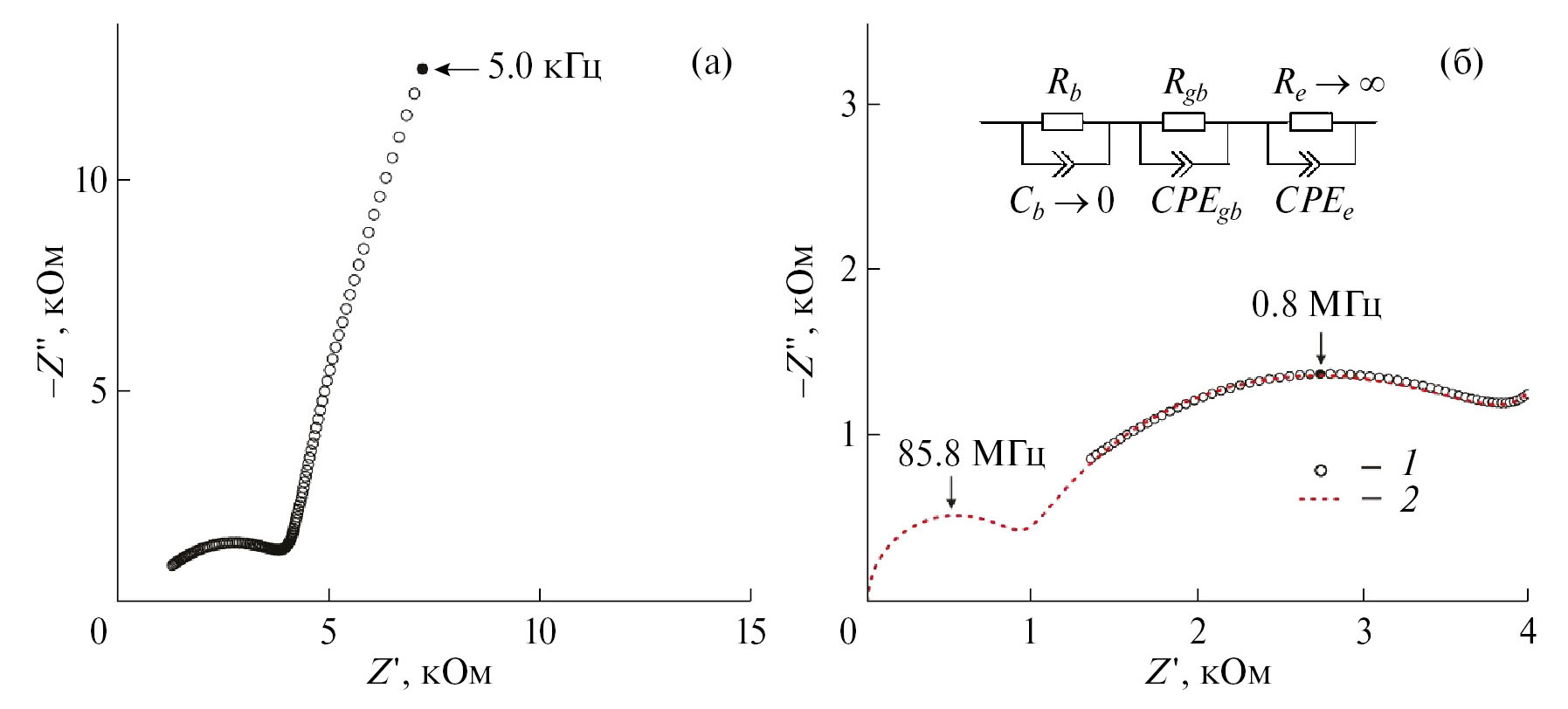 Рис. 8. Импедансный спектр образца 4 (а), высокочастотная область спектра с эквивалентной схемой (б): 1 — экспериментальный спектр, 2 — кривая, моделирующая спектр в расширенном частотном диапазоне.