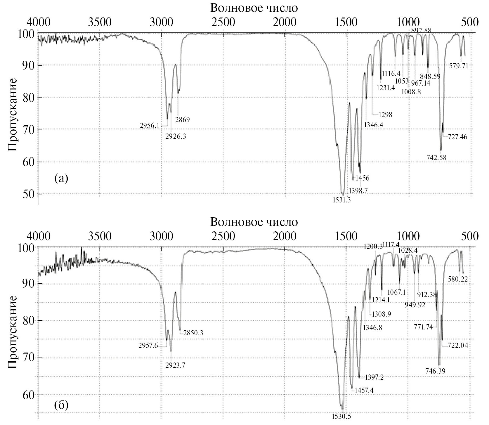 Рис. 1. ИК-спектры гексаноатов цинка (а) и марганца(II) (б), таблетки KBr.