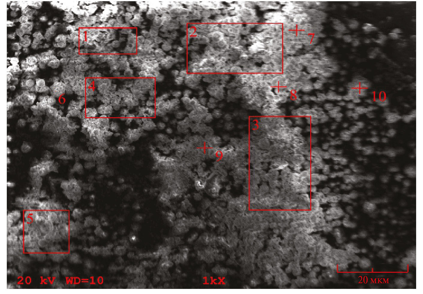 Рис. 7. Фотография с обозначением мест проведения электронно-зондового микроанализа порошка ZnS–Mn действием нефокусированного (прямоугольники) и фокусированного (крестики) рентгеновского излучения.