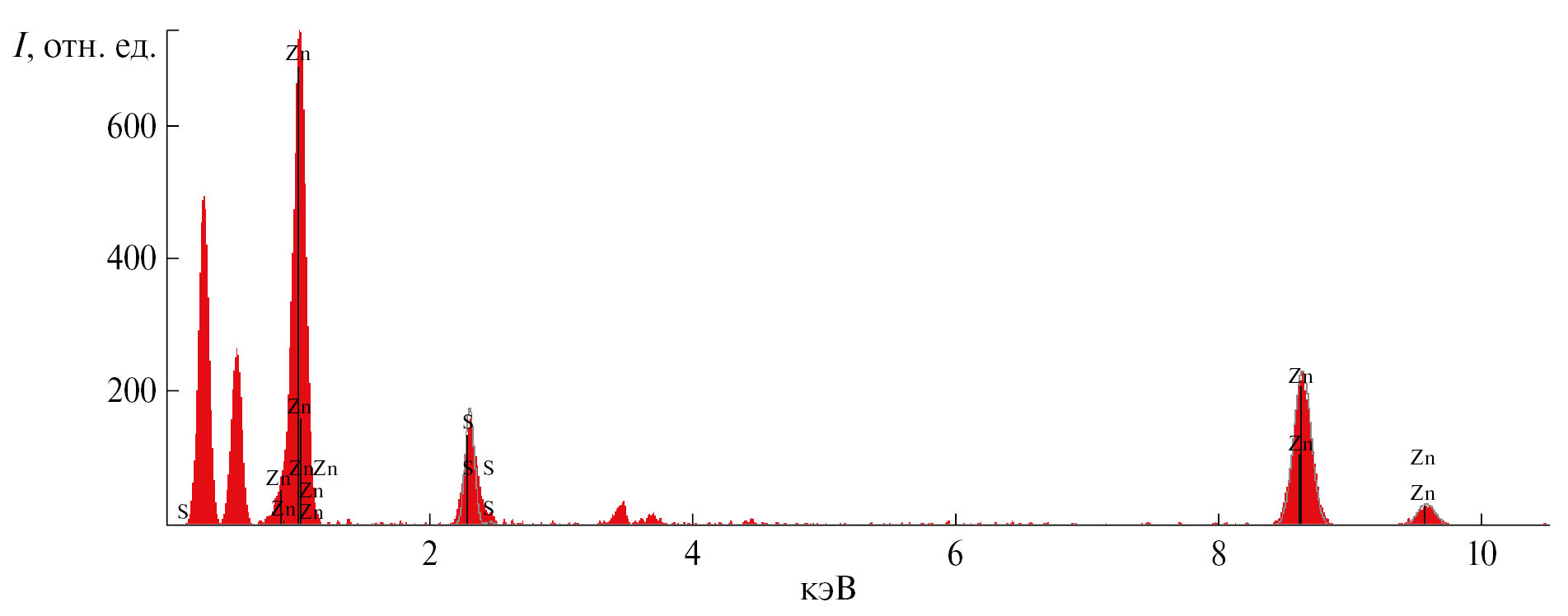 Рис. 6. Энергодисперсионный спектр поверхности порошка ZnS для области регистрации 1 (рис. 5).