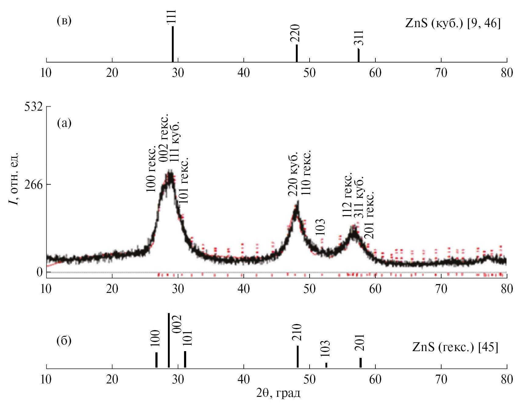 Детальный анализ процесса формирования структуры ZnS рассмотрен в обзоре [8]. В момент зарождения частиц и в частицах, размер которых составляет единицы нанометров, отмечается возможность образования политипной слоистой структуры ZnS [3, 6, 8, 45]. Авторами [9] показано образование пленок ZnS кубической или гексагональной структуры при легировании различными металлами. Отмечается, что тип образующейся структуры зависит от вида легирующего катиона [9]. Например, при легировании ионами Cu2+ образуются кристаллы легированного ZnS кубической модификации, при легировании ионами Fe2+ зарегистрированы кристаллы гексагональной модификации. Сформированность структуры авторы связывают с концентрацией легирующего компонента [9]. Синтез из водных растворов и результаты исследования порошков кубического ZnS и гетероструктур ZnS/Ag2S приведены в работе [46]. Результаты синтеза и структурного исследования пленок гексагонального ZnS на углеродных подложках обсуждаются в работе [47].