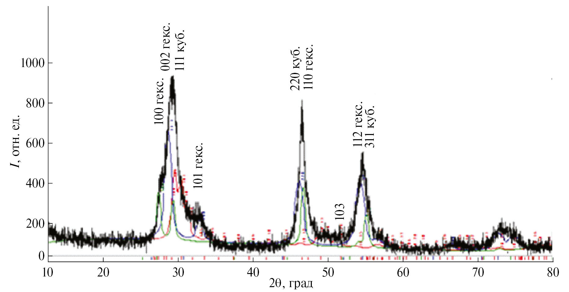 Рис. 9. Экспериментальная рентгенограмма порошка ZnS: а — отнесение рефлексов исходя из присутствия кристаллов кубической и гексагональной структур; б — отнесение рефлексов гексагональной структуры в соответствии с работой [45]; в — отнесение рефлексов кубической структуры в соответствии с работами [9, 46].