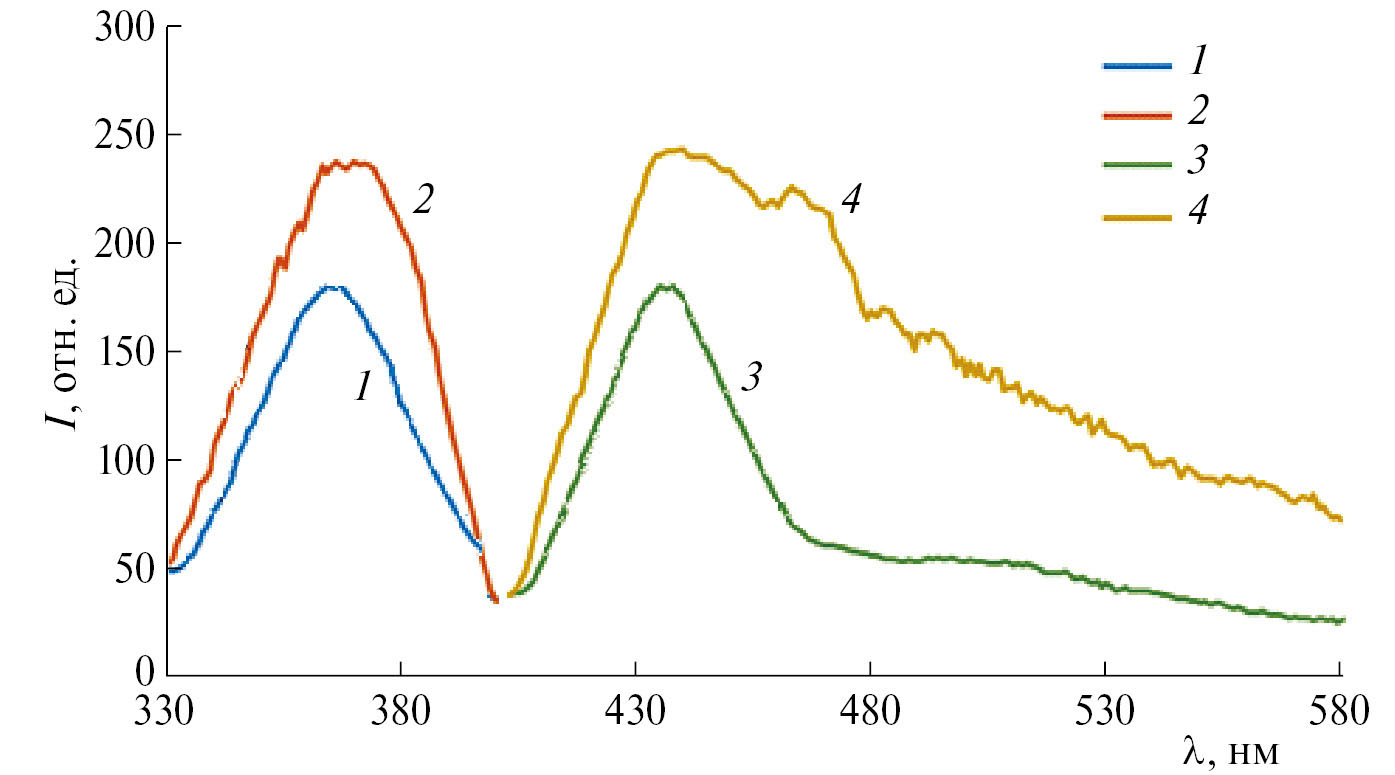 Рис. 11. Спектры возбуждения фотолюминесценции (1, 2) и фотолюминесценции (3, 4) образцов ZnS (1, для люминесценции λл = 450 нм, 3, при возбуждении λв = 360 нм) и ZnS–Mn (2, для люминесценции λл = 469 нм, 4, при возбуждении λв = 360 нм).
