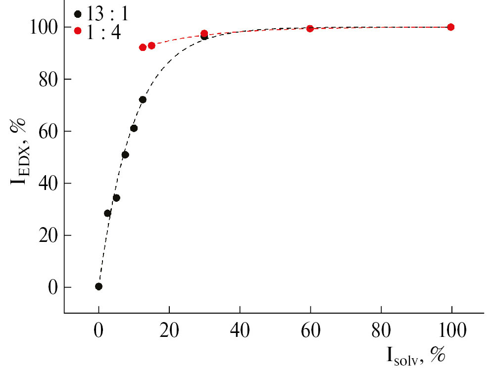 Энергодисперсионная рентгеновская спектроскопия (EDX). Спектры EDX для соединений p0–p13 были получены на электронном микроскопе Carl Zeiss NVision 40 с детектором Oxford Instruments X-Max (80 мм2) при ускоряющем напряжении 20 кВ. Данные EDX были получены с области образца (0.5 × 0.6 мкм) для получения усредненного состава. По данным EDX образцов p0, p1, p2a, p9–p13, отношение Bi : X (сумма галогенов) составляет 1 : 4.00 ± 0.05, для образцов p3–p8 — 1 : 4.46 ± 0.07. Ошибка определения весовой доли атомов галогенов ~1%. Мольную долю иода среди галогенов в выделяемых продуктах, по данным EDX, определяли из соотношения сигналов галогенов: