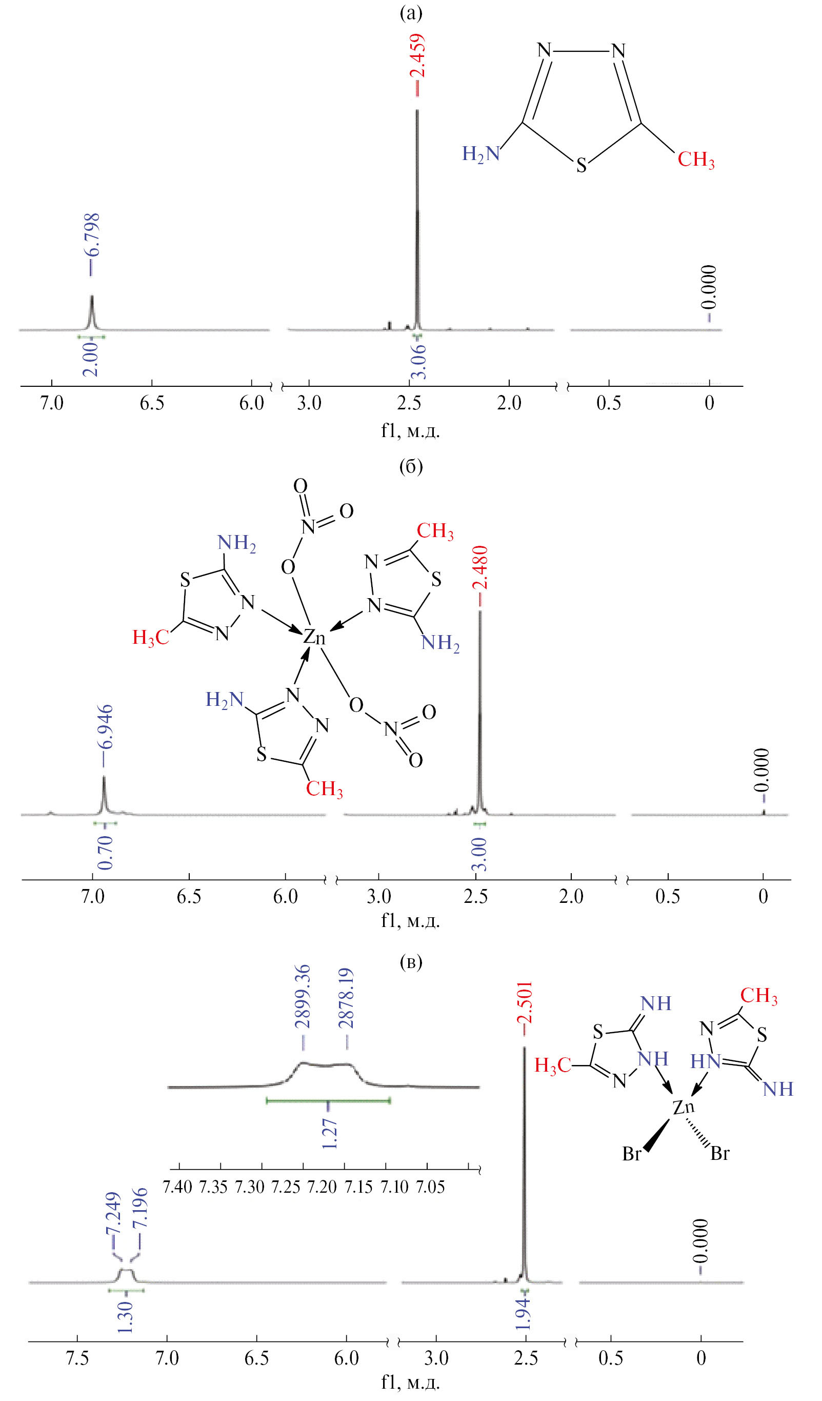 Интересные результаты были получены при исследовании лигандов и синтезированных на их основе новых комплексных соединений методом 1Н ЯМР-спектроскопии в растворе ДМСО-d6 + CCl4 (400 МГц), значения химических сдвигов (δ, м.д. (ppm)) приведены на рис. 1, 2. В спектре L2 синглетный сигнал в поле ä = 2.46 м.д. относится к трем протонам СН3-группы, а синглетный сигнал в поле ä = 6.798 м.д. принадлежит двум протонам NH2-группы. Синглетные сигналы при ä = 2.48 м.д. относятся к протонам метильной группы в комплексе VI, а сигналы при ä = 6.946 м.д. – к двум протонам аминогруппы.