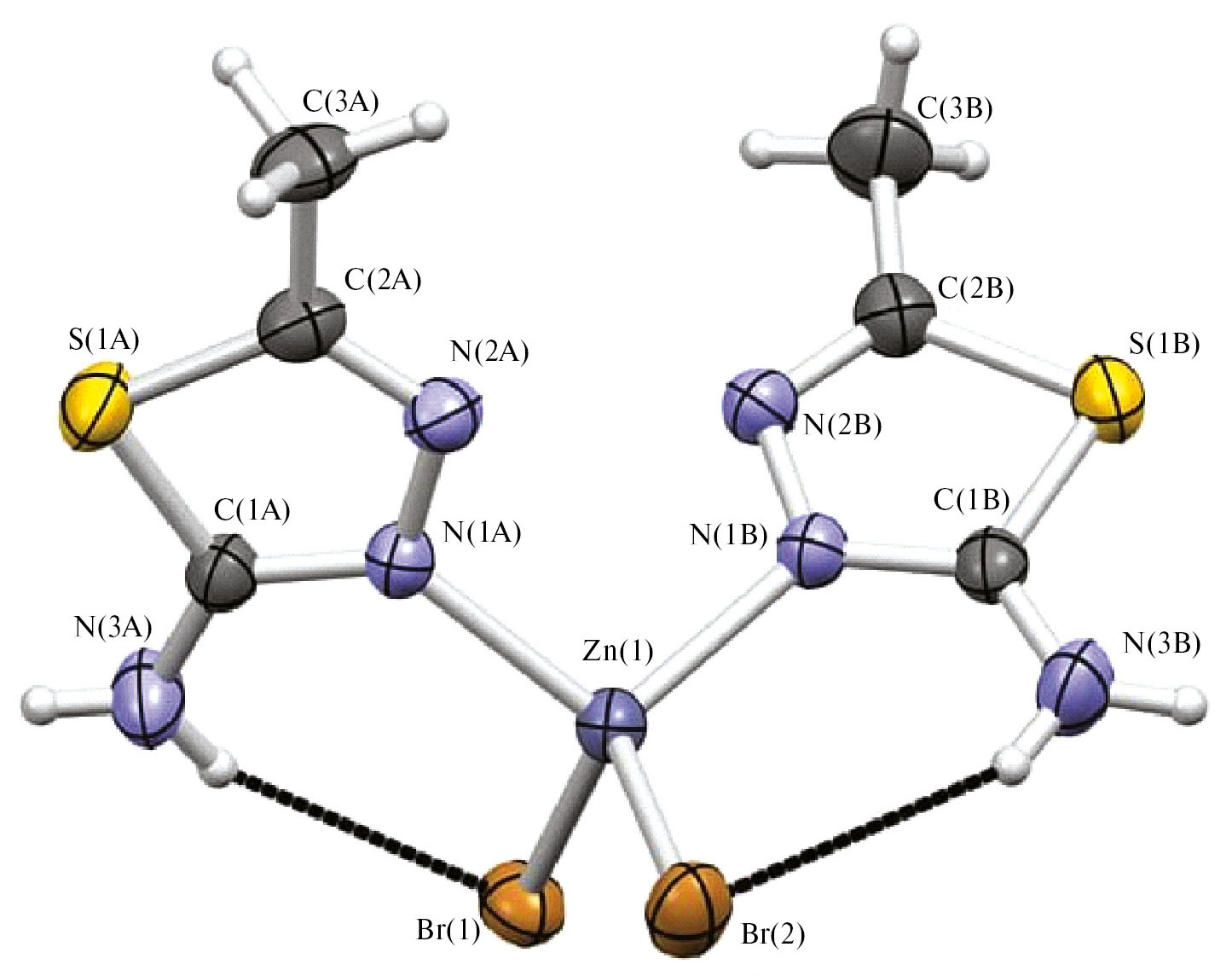 Аналогично синтезирован комплекс [ZnL13(NO3)2] (V) [33]. Элементный анализ соединений на C, H, N выполняли на приборе ЕА 1108 Carlo Erba, Zn определяли на приборе Perkin Elmer 3030В. Перекристаллизацией [ZnL22Br2] из этанола получены монокристаллы C6H10N6S2Br2Zn, пригодные для РСА.