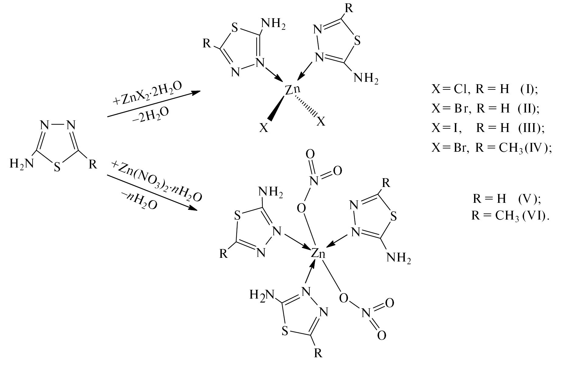 В данной работе синтезированы комплексы галогенидов цинка(II) (I–IV) и нитрата цинка(II) (V–VI) с лигандами L1 (2-аминотиадиазол-1,3,4) и L2 (2-амино-5-метилтиадиазол-1,3,4) и определено их строение. Указанные комплексы получены по реакции (схема 1).