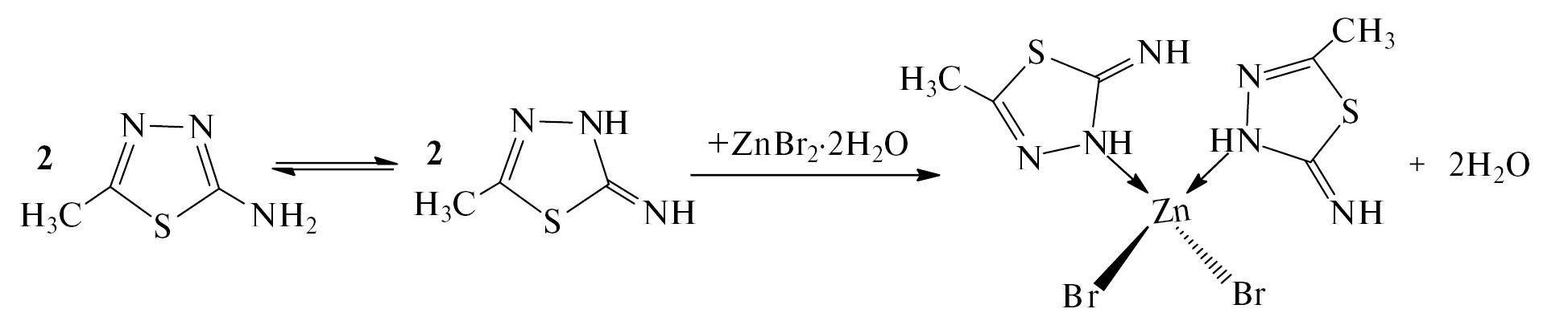 В тетраэдрически окруженном комплексе IV синглетный сигнал от трех атомов водорода метильной группы регистрировали при ä = 2.501 м.д., а дублетные сигналы от атома водорода иминной группы и атома водорода азометина в цикле – при ä = 7.196 и 7.249 м.д. [39, 40]. Можно сделать вывод, что лиганд L2 в растворе подвергается амино-иминной таутомерии при комплексообразовании с солью бромида цинка, при этом один из атомов водорода в аминогруппе смещается к эндоциклическому атому азота в α-положении от аминогруппы (схема 2).