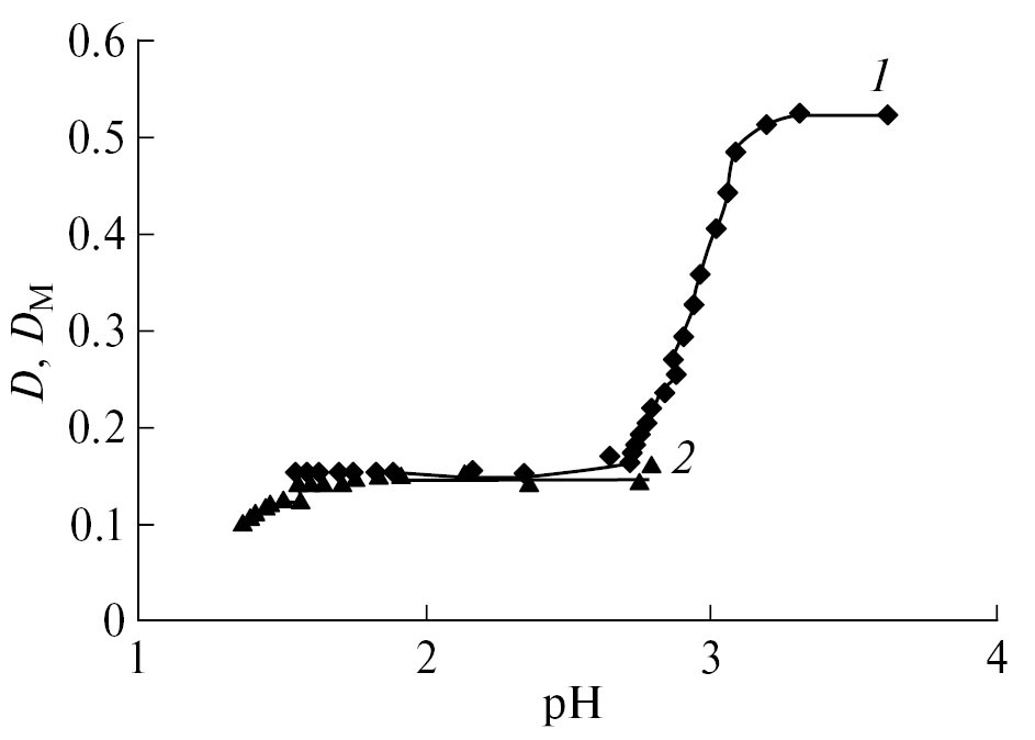 Рис. 3. Изменение оптической плотности растворов системы Fe3+‒H2Asp от pH (СFe = СAsp = 3.125 × × 10−3 моль/л; Vобщ = 6 мл; I = 0.3; λэф = 400 нм): 1 — D; 2 — DM.