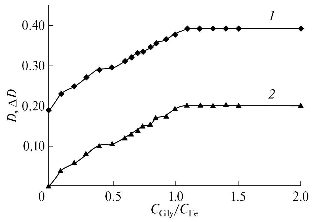 Рис. 4. Изменение оптической плотности растворов системы (Fe3+‒2H2Suc)‒HGly (СFe = 4.167 × × 10−3 моль/л; СSuc = 8.34 × 10−3 моль/л; pH 2.43; λэф = 400 нм): 1 – D; 2 – ΔD.
