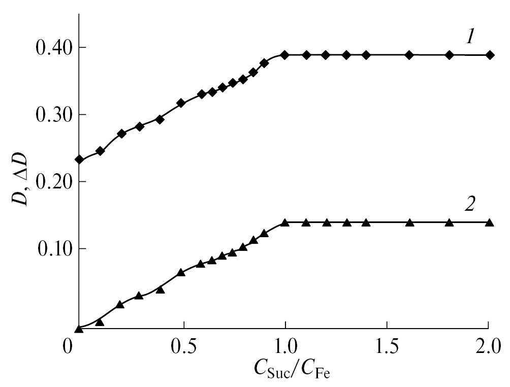Рис. 5. Изменение оптической плотности растворов системы (Fe3+‒HGly)‒H2Suc (СFe = СGly = 4.167 × × 10−3 моль/л; pH 2.43; lэф = 400 нм): 1 – D; 2 – ΔD.