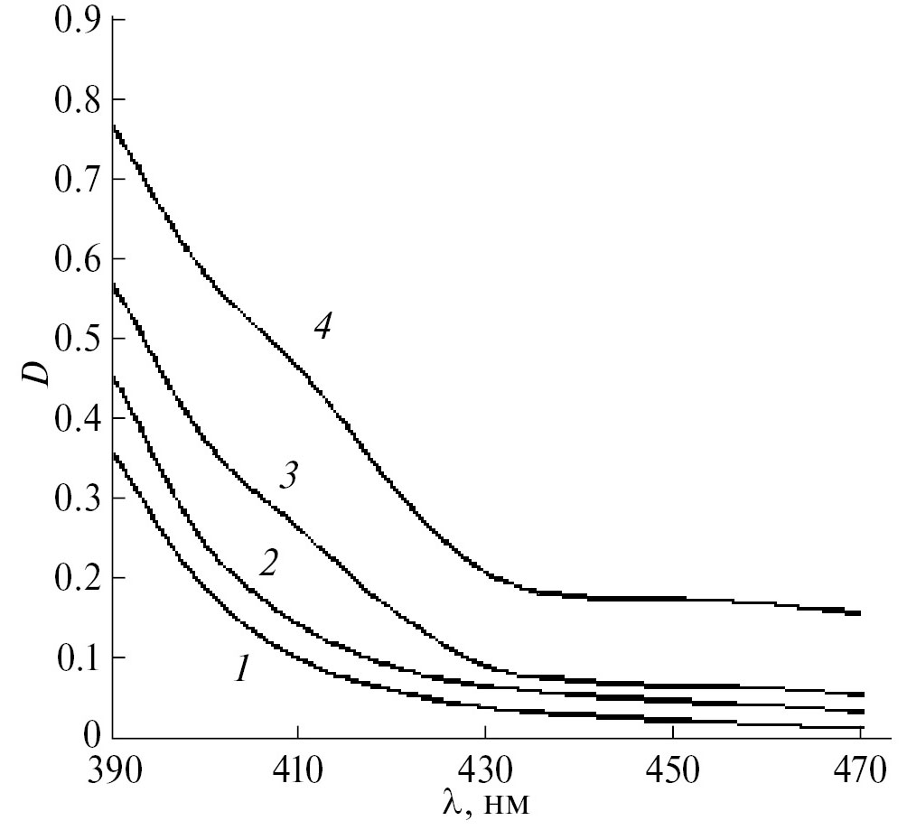 Рис. 7. Электронные спектры поглощения систем: 1 — FeCl3, 2 — FeCl3– HGly, 3 — FeCl3–H2Suc, 4 — FeCl3–HGly–H2Suc (СFe = CL = 5 × 10‒3 моль/л; pH 2.3–2.5).