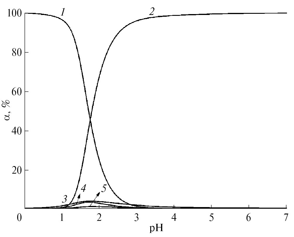 Рис. 8. Диаграмма выхода частиц в зависимости от pH в системе Fe3+‒H2Suc‒HGly: 1 — Fe3+, 2 — FeSucGly, 3 — FeOH2+, 4 — FeGly2+, 5 — FeSuc+ (CFe = CSuc = = CHGly = 4.17 × 10−3 моль/л).