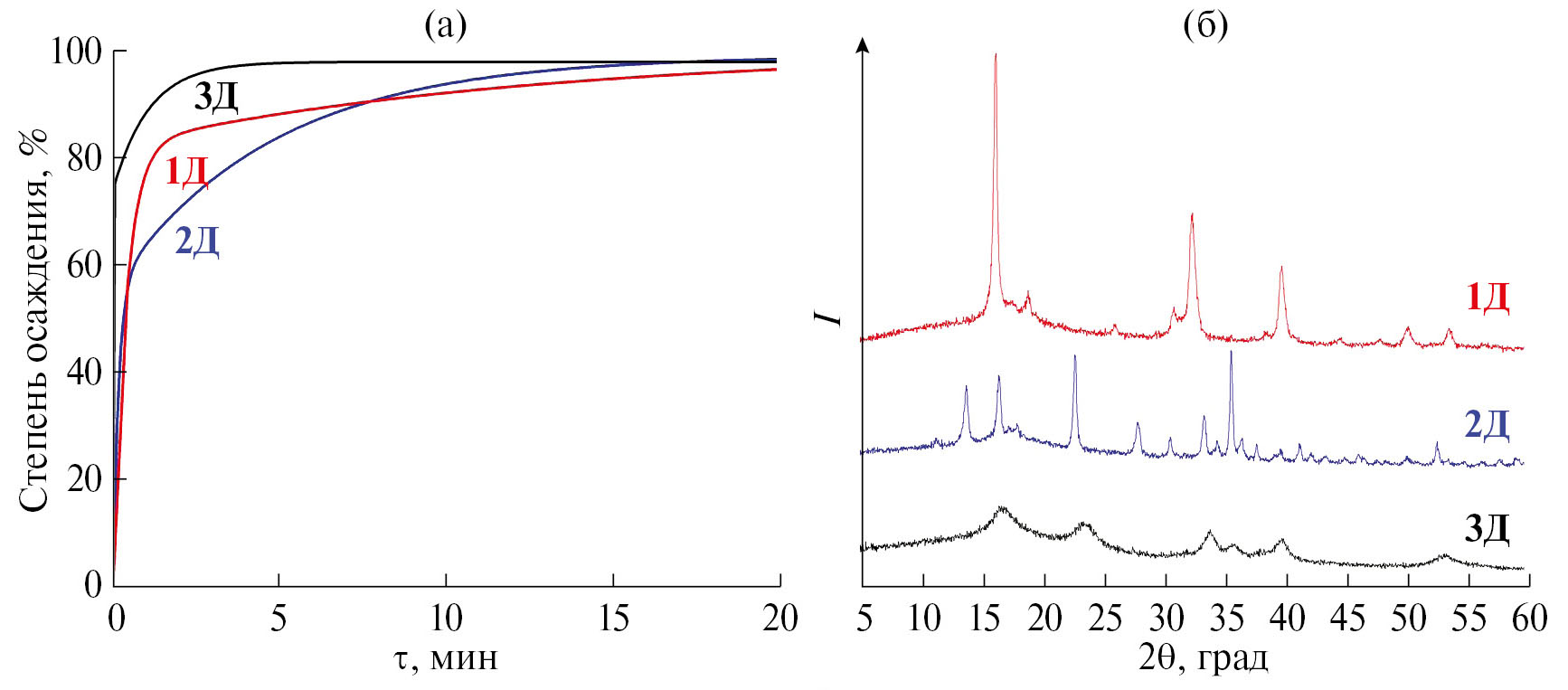 Рис. 1. Изменение степени анионообменного осаждения Сu2+ в присутствии декстрана со временем (а) и рентгенограммы полученных продуктов 1Д–3Д (б).