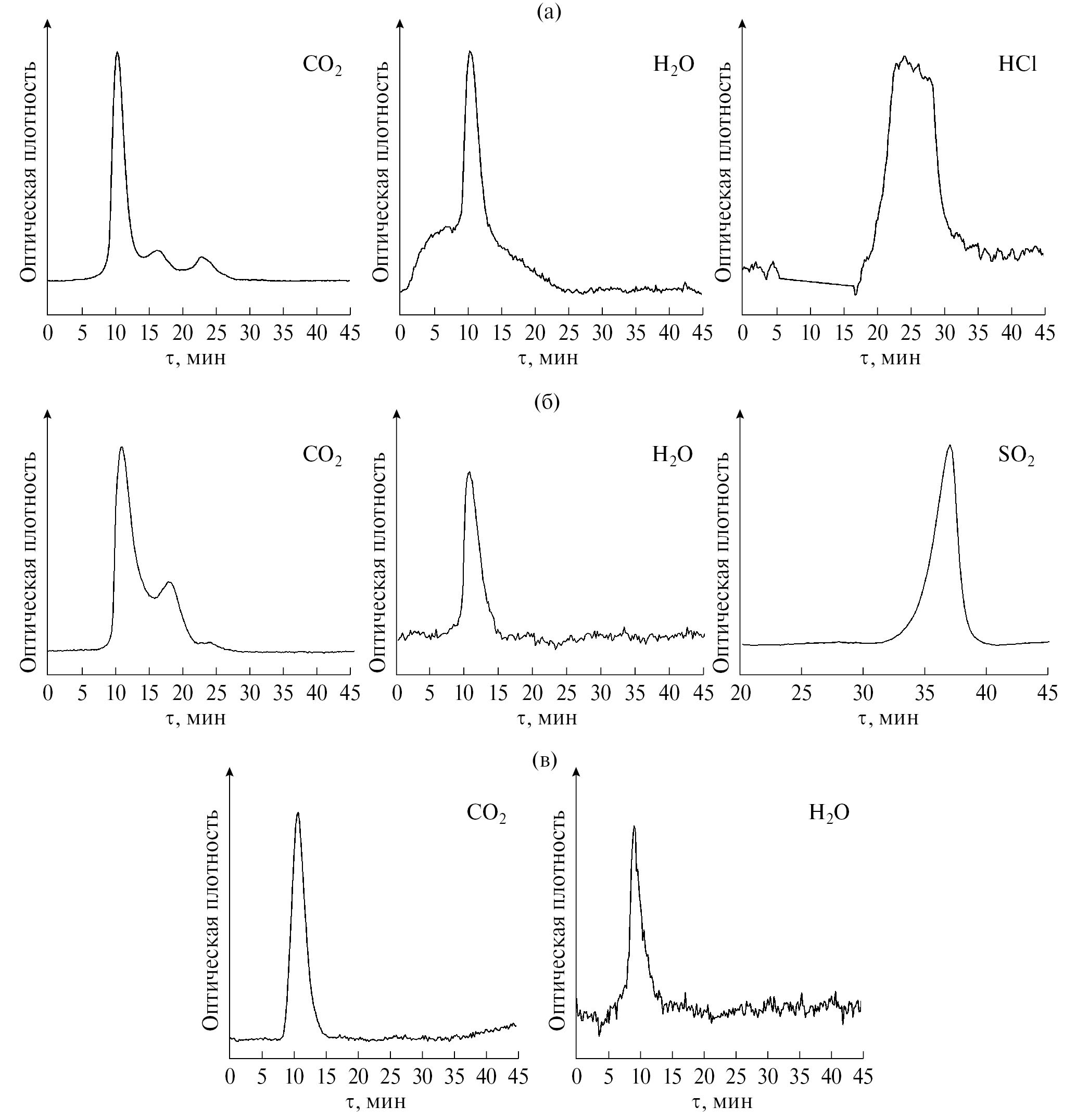 Рис. 3. Зависимость оптической плотности газов, выделяющихся при термическом анализе, от времени для образцов 1Д (а), 2Д (б), 3Д (в) (табл. 1), полученных в ходе анионообменного осаждения Cu2+ в присутствии декстрана.