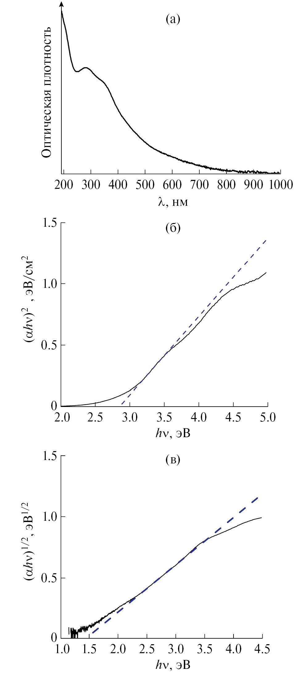Рис. 9. Оптический спектр поглощения гидрозоля наночастиц CuO (a) и графики Тауца (б, в) для определения ширины запрещенной зоны.