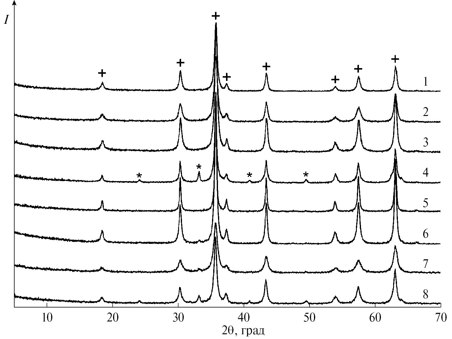 Рис. 3. Дифрактограммы образцов, полученных в опытах 1–8: + — NiFe2O4, * — Fe2O3.