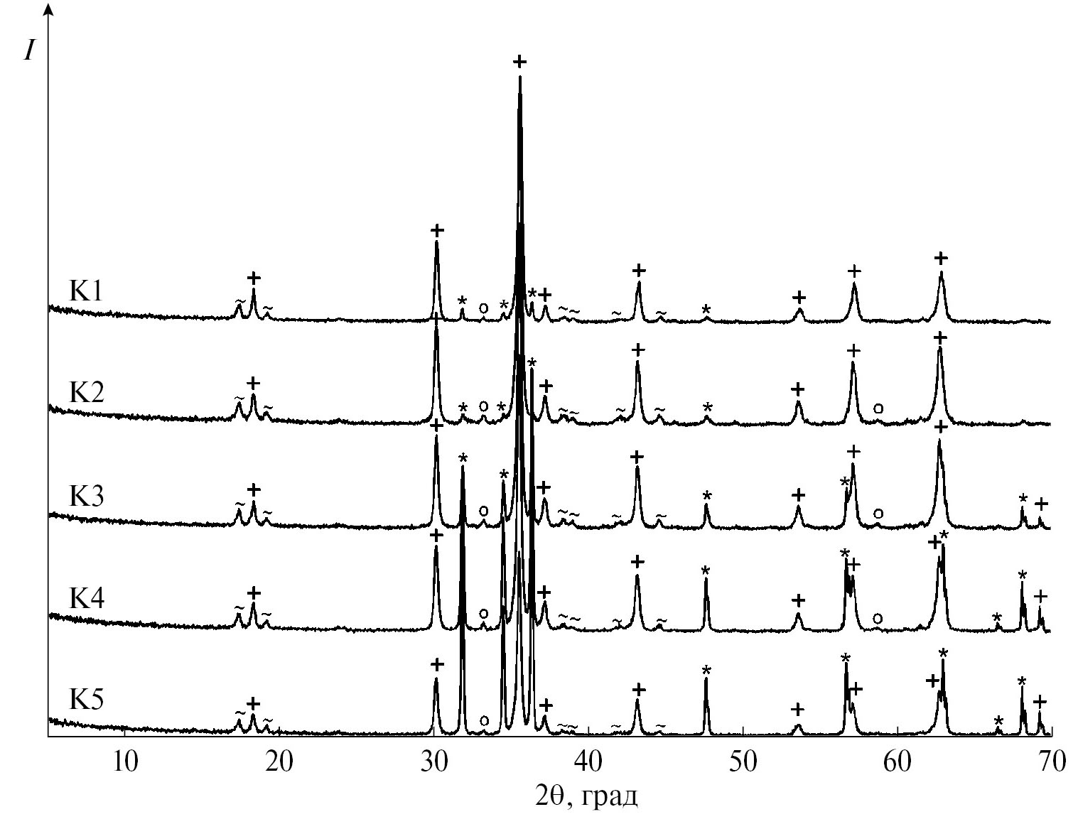 Рис. 6. Дифрактограммы композитов, полученных на основе NiFe2O4 и ZnO после обжига при 800°С: + – ZnxNi1–xFe2O4, * – ZnO, o – Fe2O3, ~ – неидентифицируемые рентгеновские рефлексы.